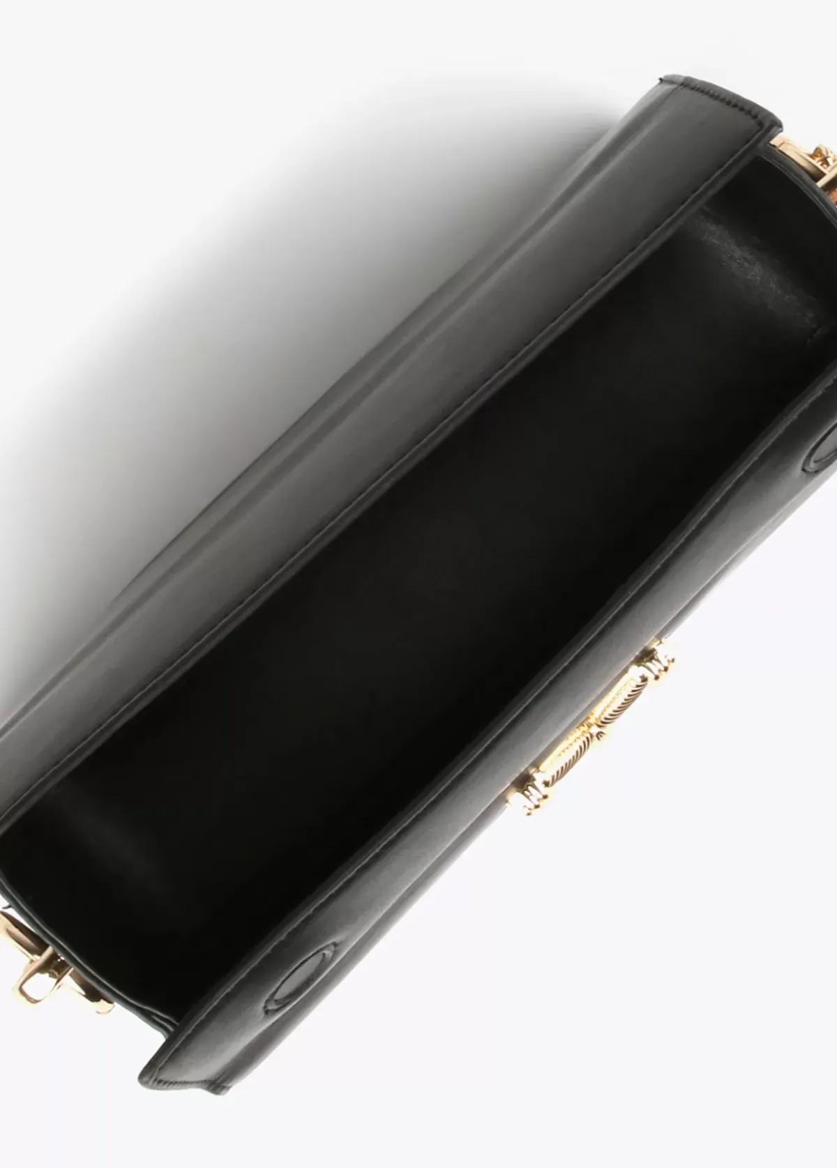 Bolso bandolera rectangular con asa de cadena extraíble. Cierre con botones imantados y detalle letra logo dorada en parte frontal.