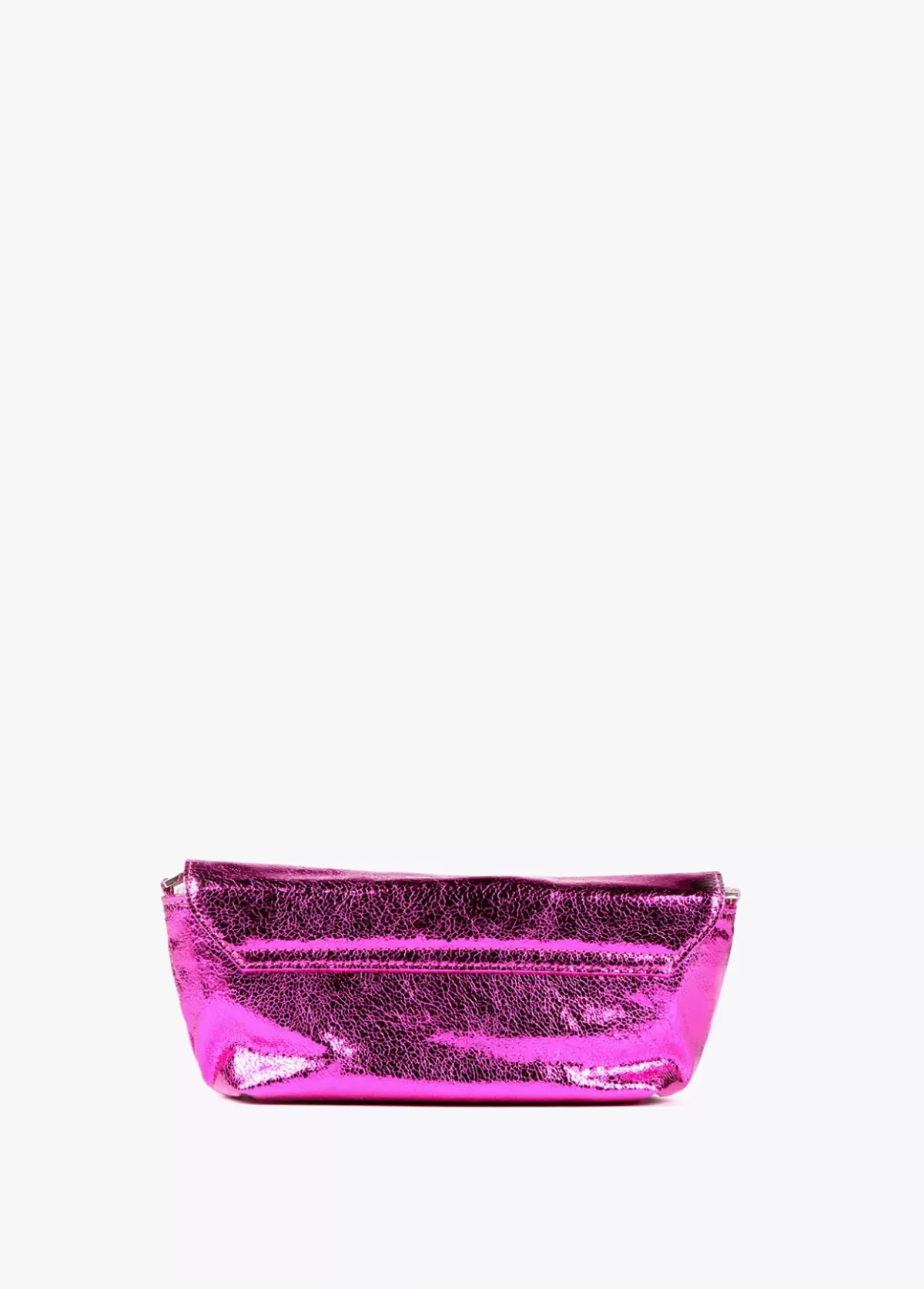 Bolsito bandolera metalizado con asa bandolera de cadena dorada extraíble. Maxi letra M dorada en solapa, cierre con botón imantado.
