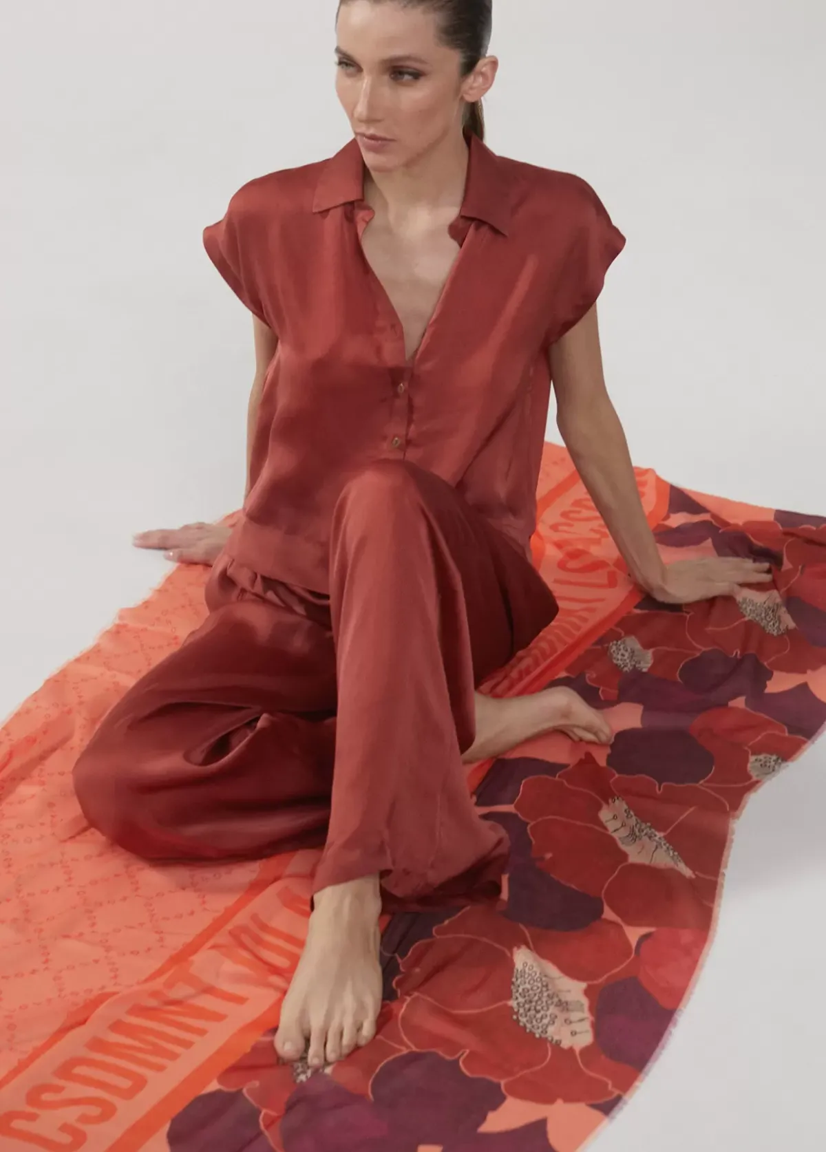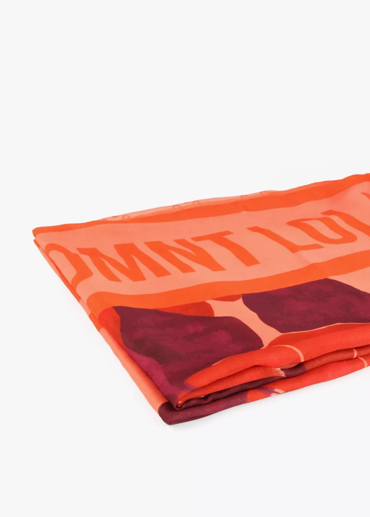 Fulard con maxi monograma combinado con motivos florales en tonos naranjas.