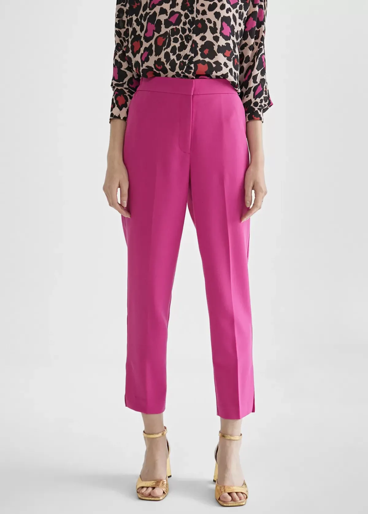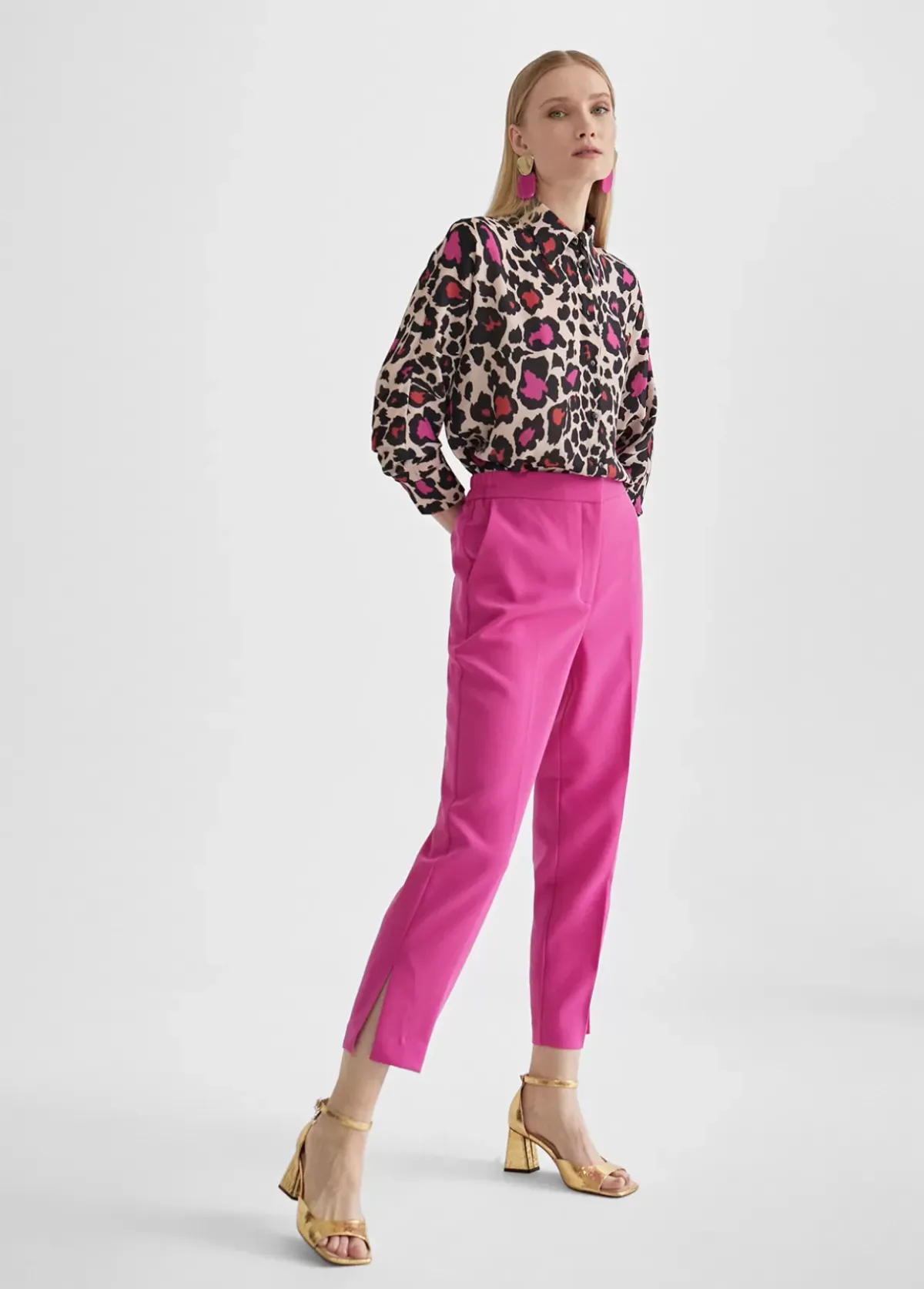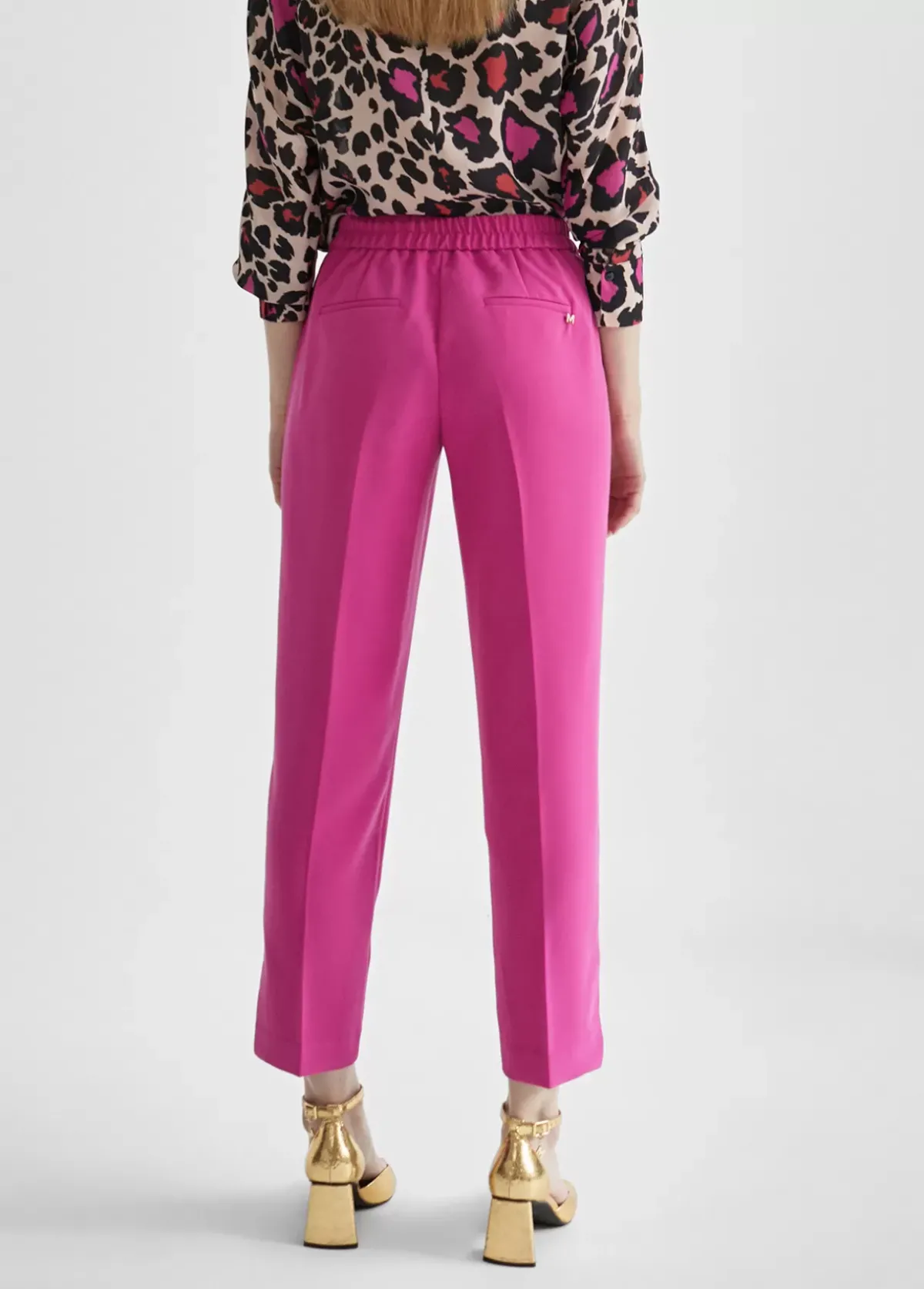 Pantalón en color fucsia y goma en cintura con aberturas laterales en bajo. Cierre con cremallera y botón invisible. Falsos bolsillos traseros con letra logo dorada. Bolsillos laterales.