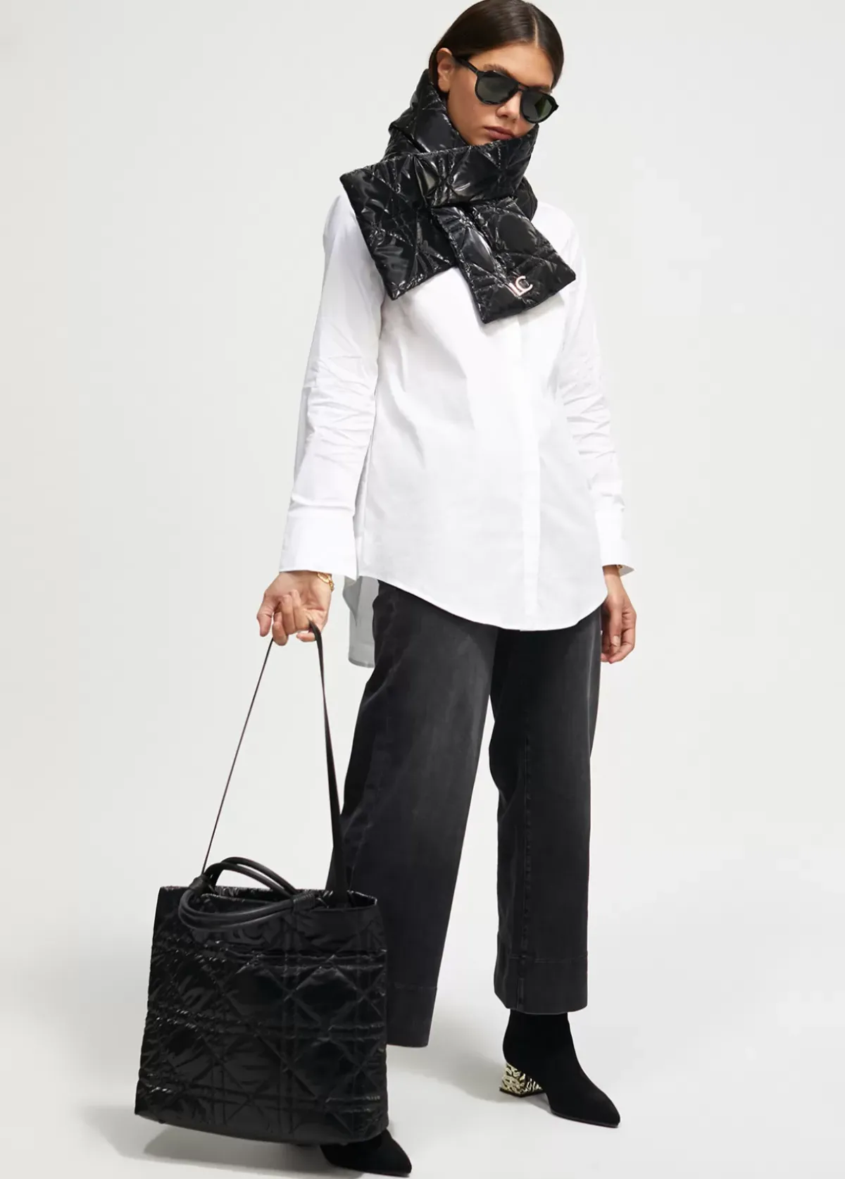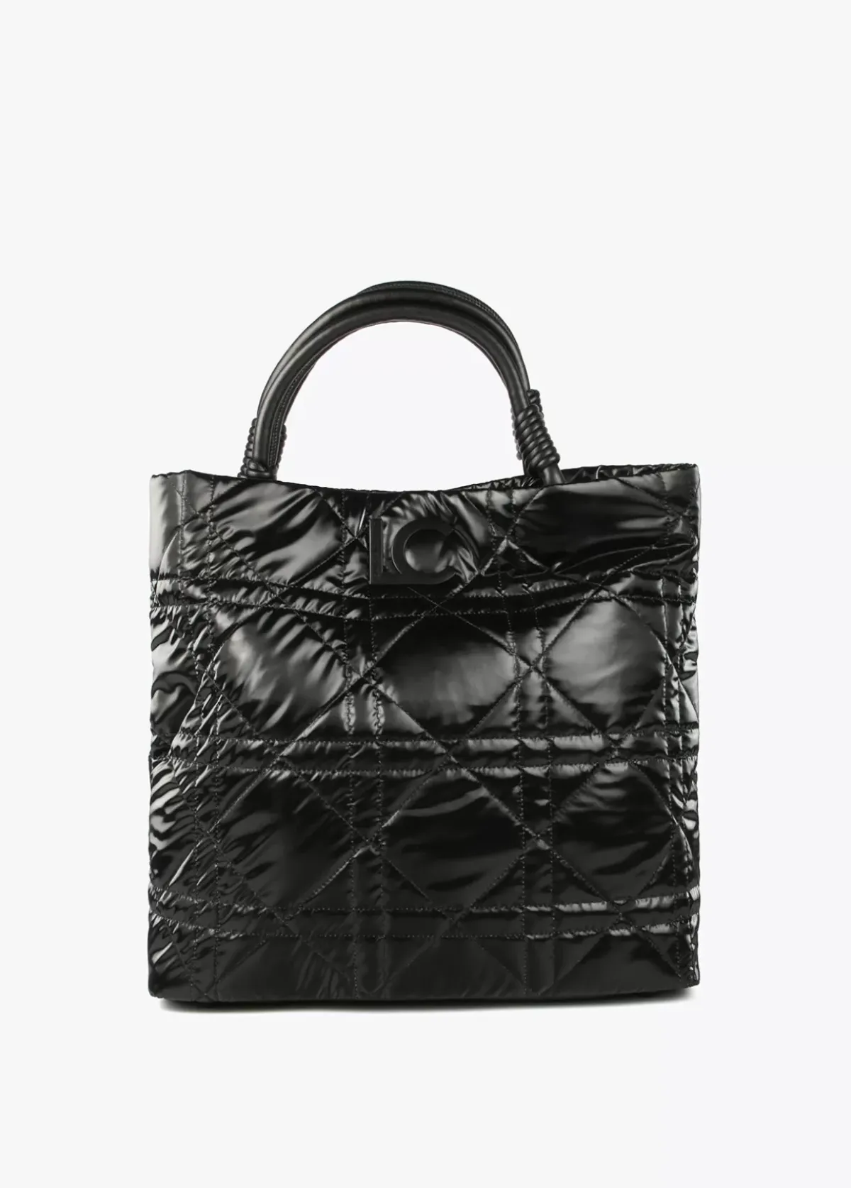 Bolso tipo shopper acolchado de nylon en efecto brillante y logo en parte frontal. Asas de hombro y asa bandolera y bolsito neceser interior con cremallera.
