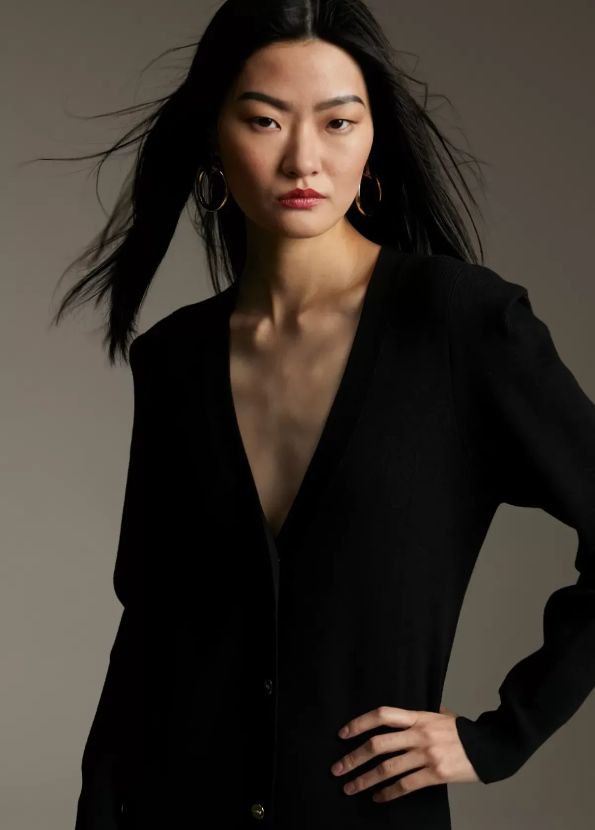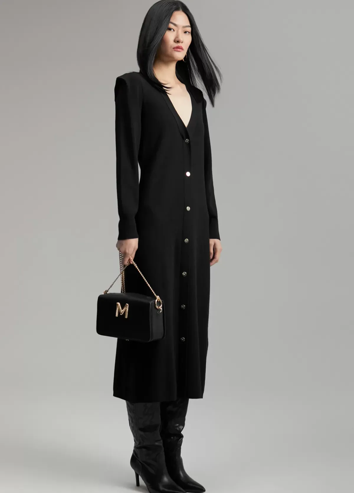 Vestido de punto de largo midi con hombreras. Escote pico.