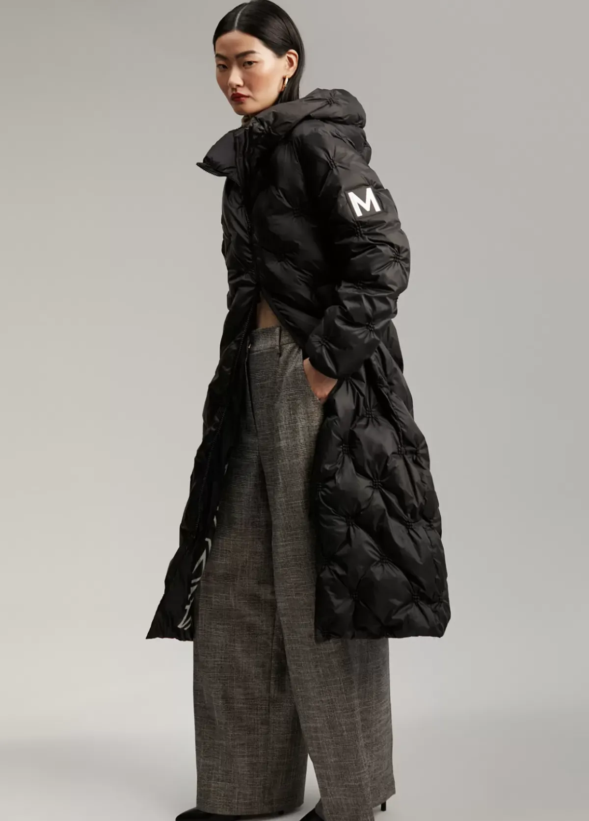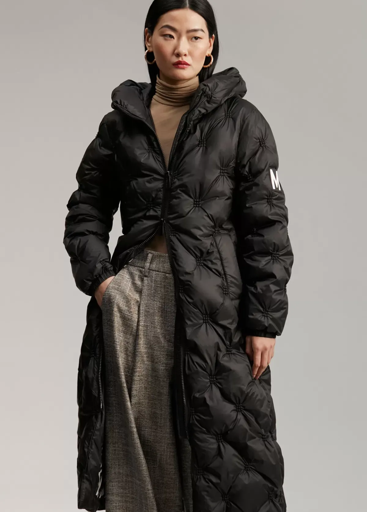 Abrigo largo con capucha y acolchado. Cerrado con cremallera de doble carro. Bolsillos laterales. Detalle M silicona bicolor en manga.
