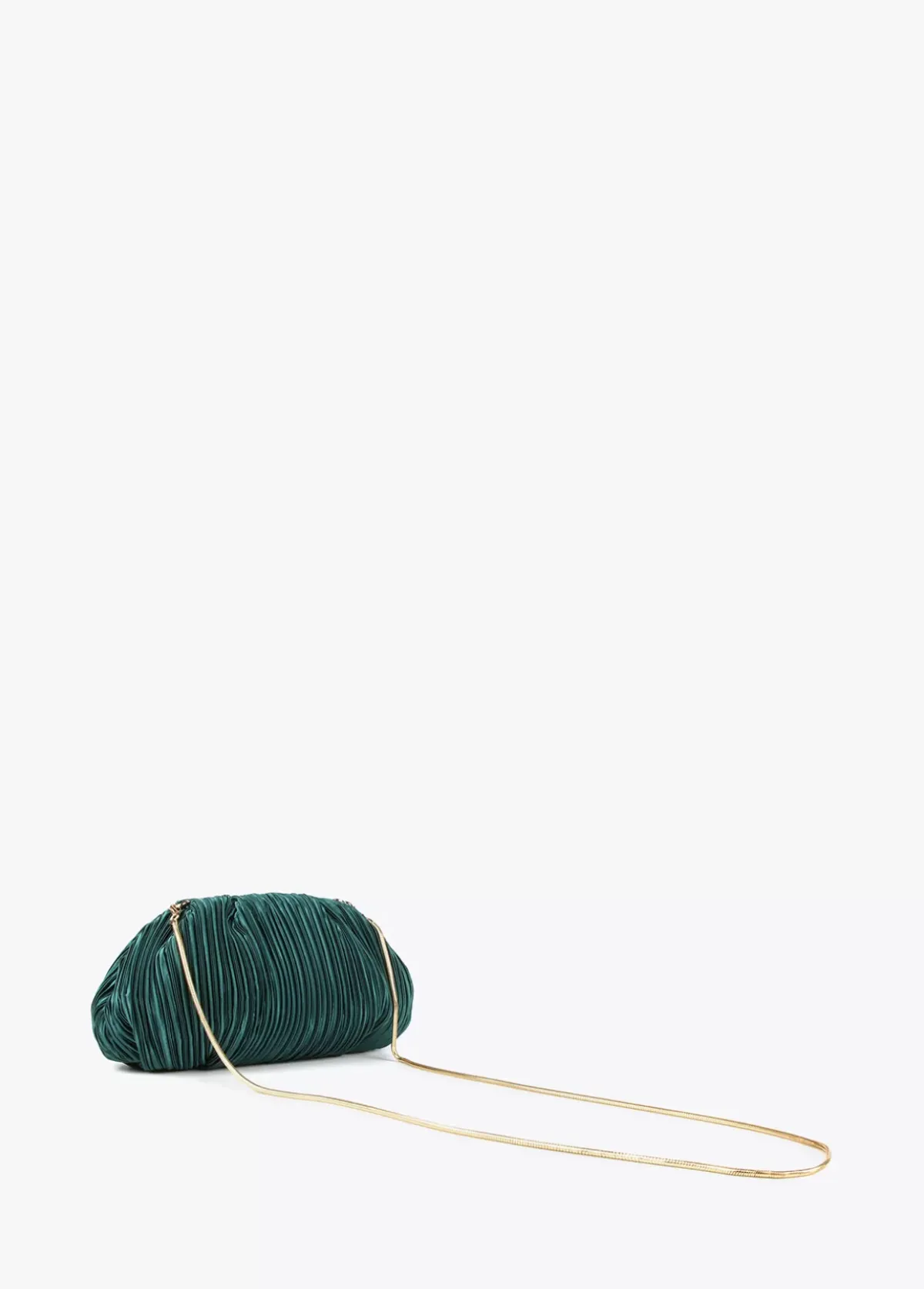 Bolso de fiesta con forma de concha plisado con cadena dorada extraíble. Detalle letra logo dorada en parte frontal.
