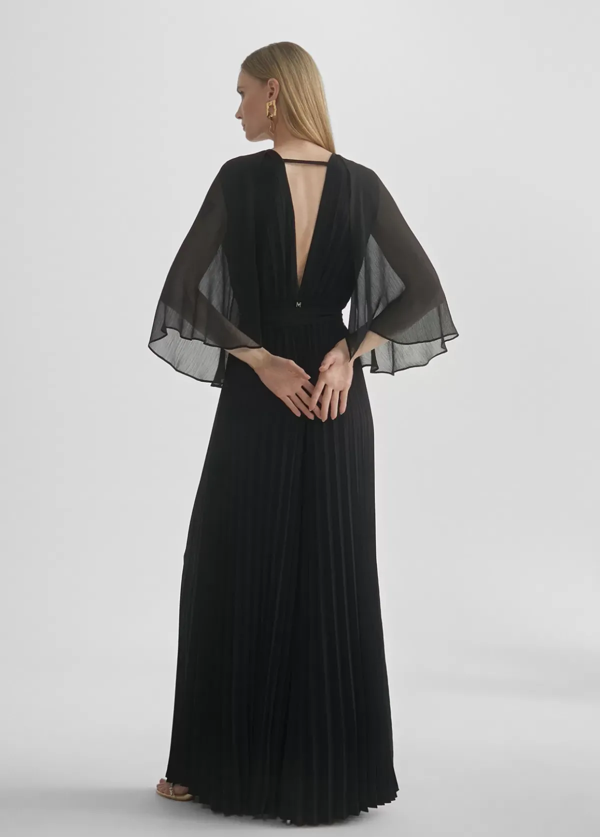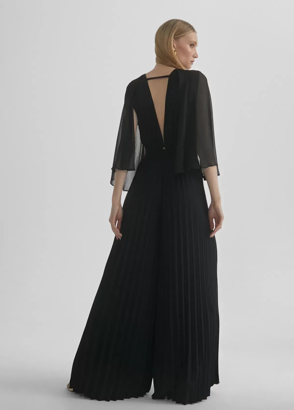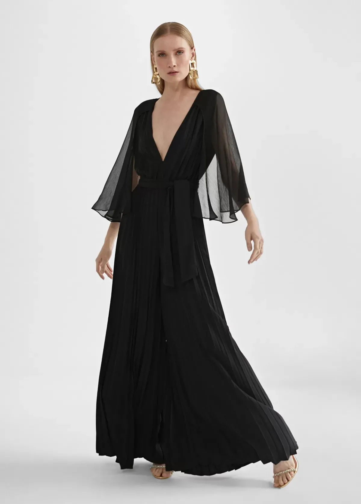 Mono largo plisado de tejido fluido. Escote pico en frontal y espalda. Cinturilla elástica. Mangas efecto capa. Cinturón del mismo tejido y color.
