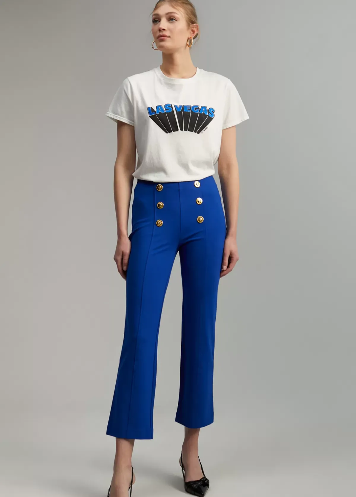 Pantalón de largo tobillero y ligeramente acampanado en bajo. Detalle de botones metálicos dorados en frontal. Cremallera lateral y falso bolsillos de vivo en espalda.
