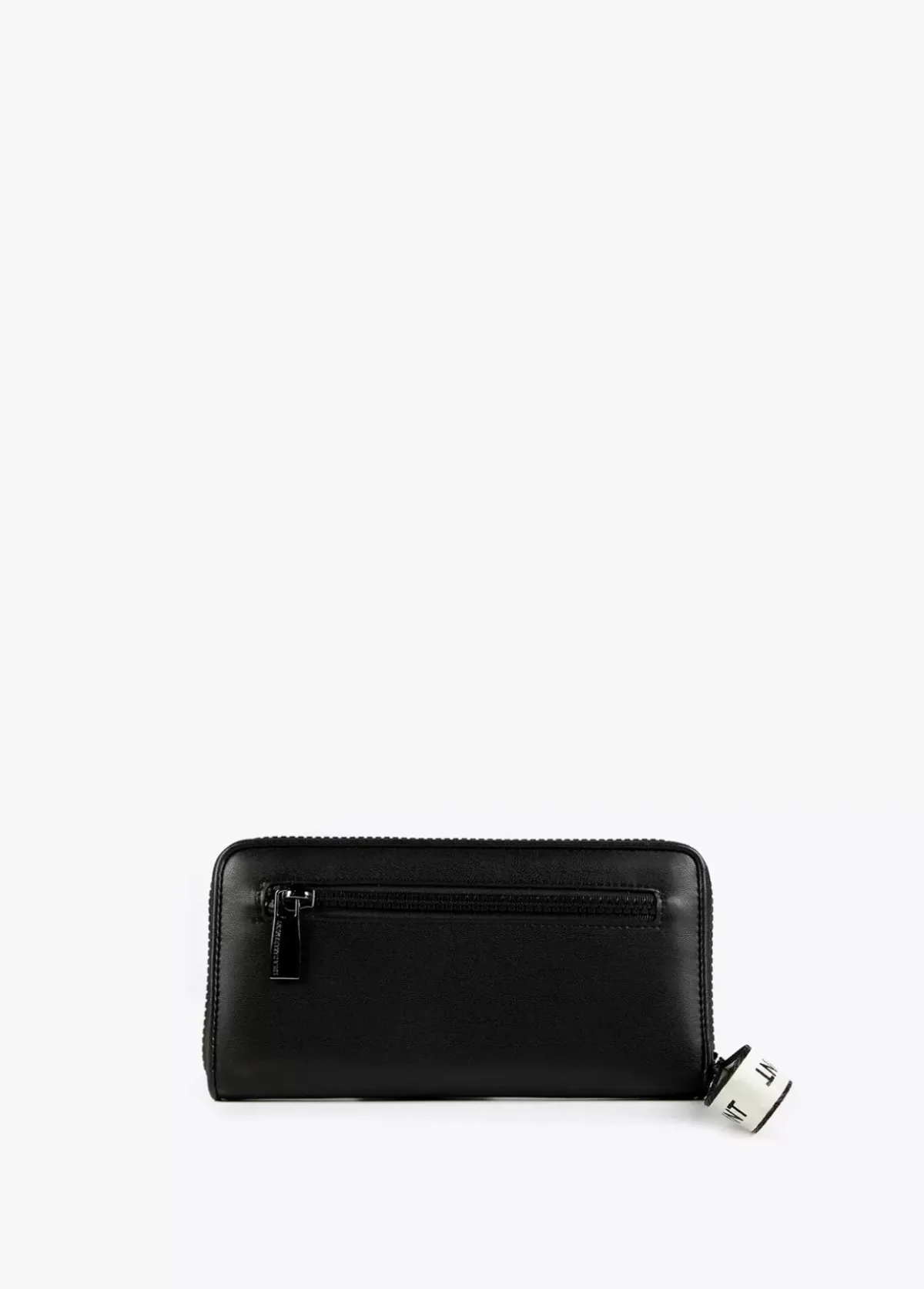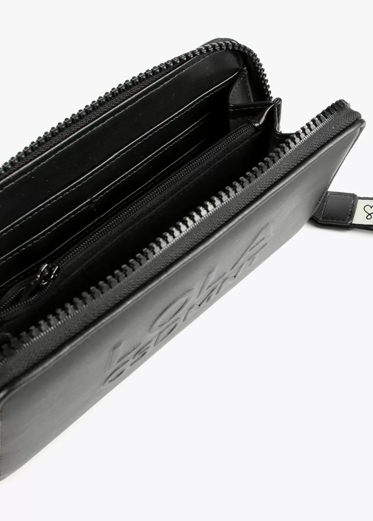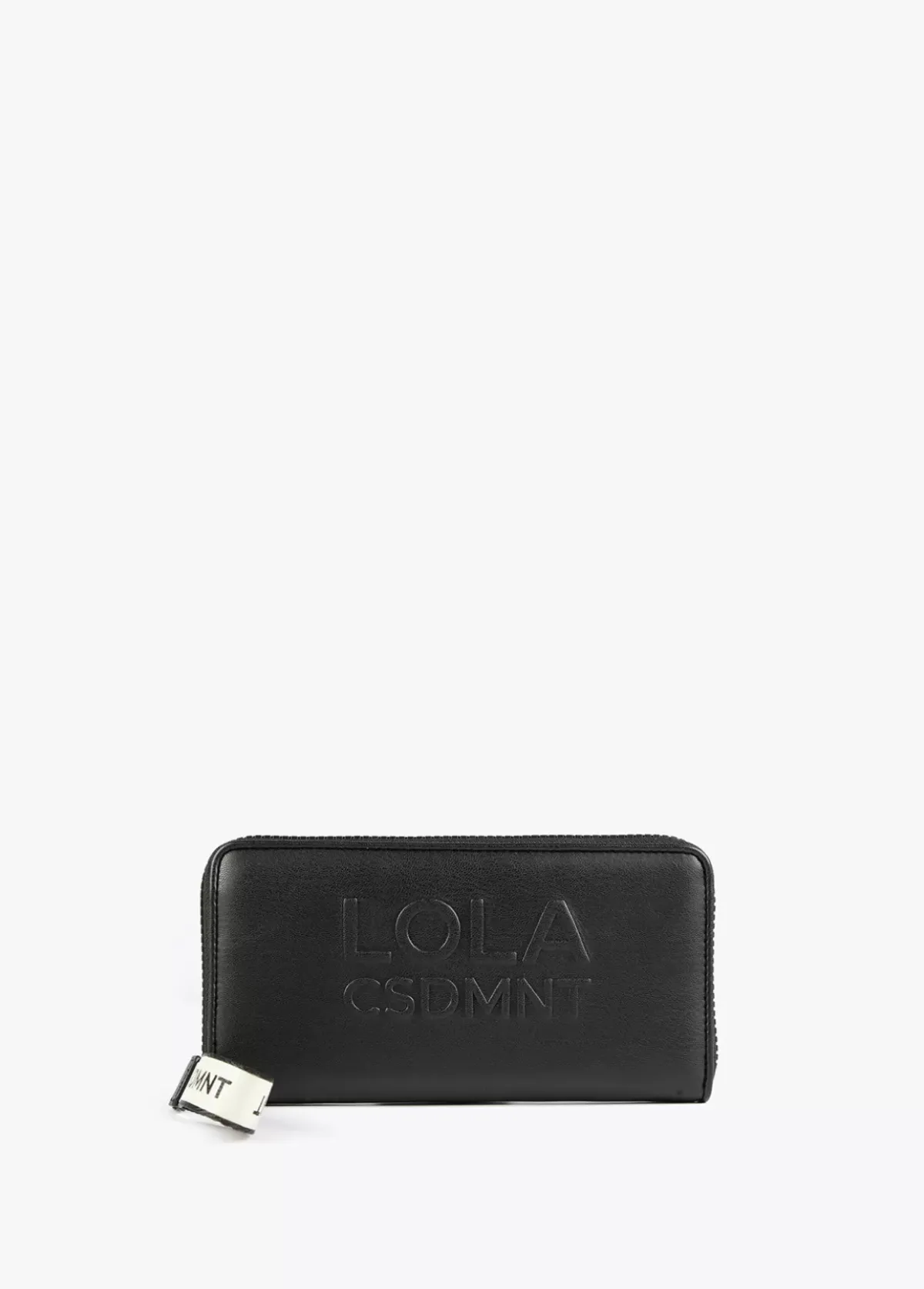 Billetero grande en efecto piel y logo en relieve. Asa de mano logotipada, cierre de cremallera y logo lacado en parte frontal.