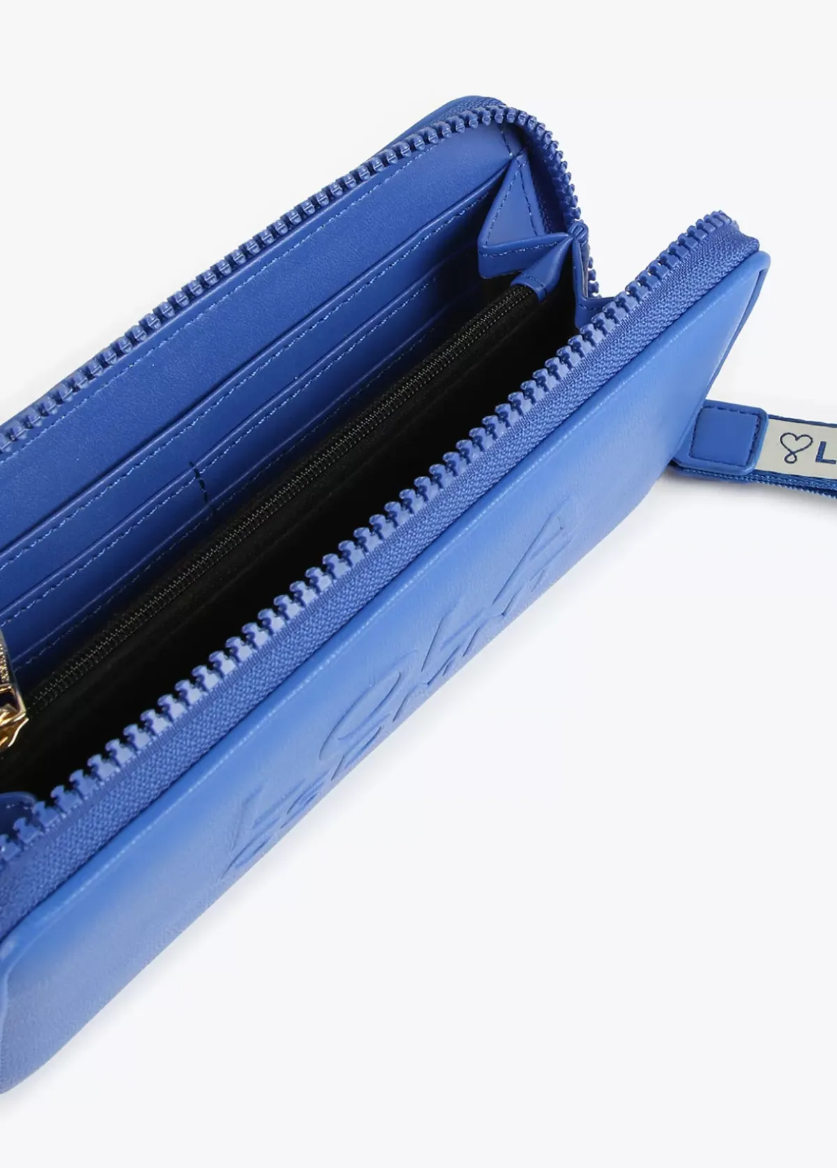 Billetero grande en efecto piel y logo en relieve. Asa de mano logotipada, cierre de cremallera y logo lacado en parte frontal.