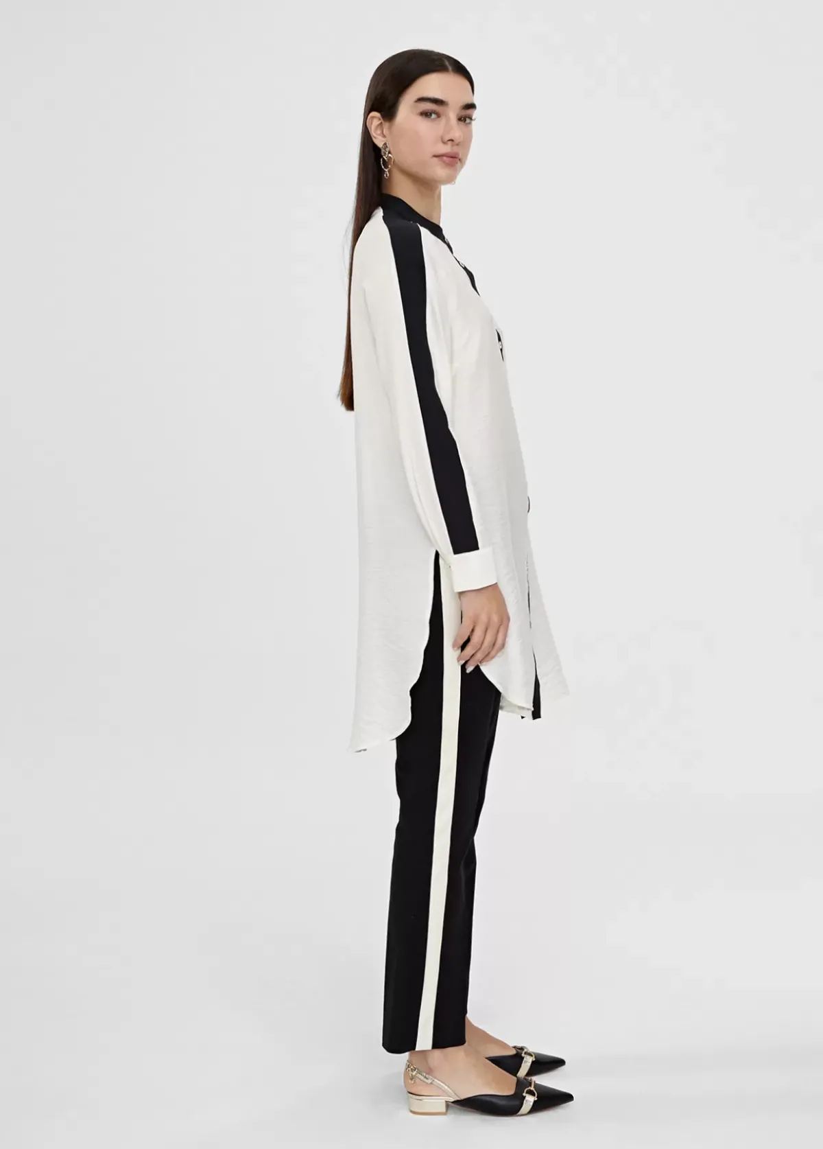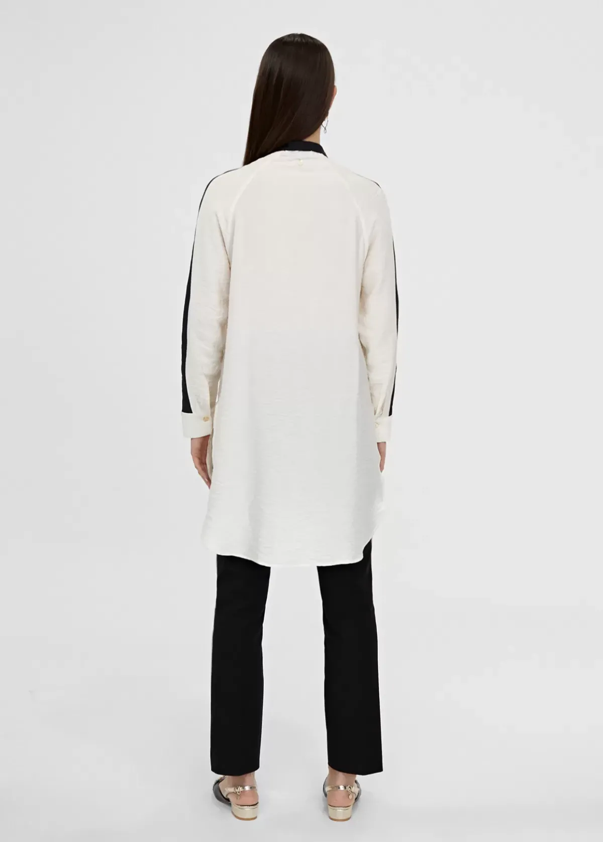 Blusón bicolor, largo y con mangas. Detalle de color en cuello mao, tapeta frontal y banda en mangas. Cerrado con botones.