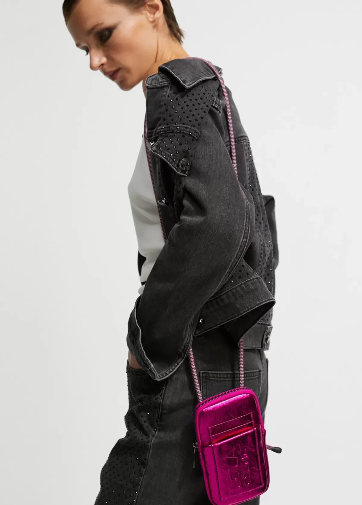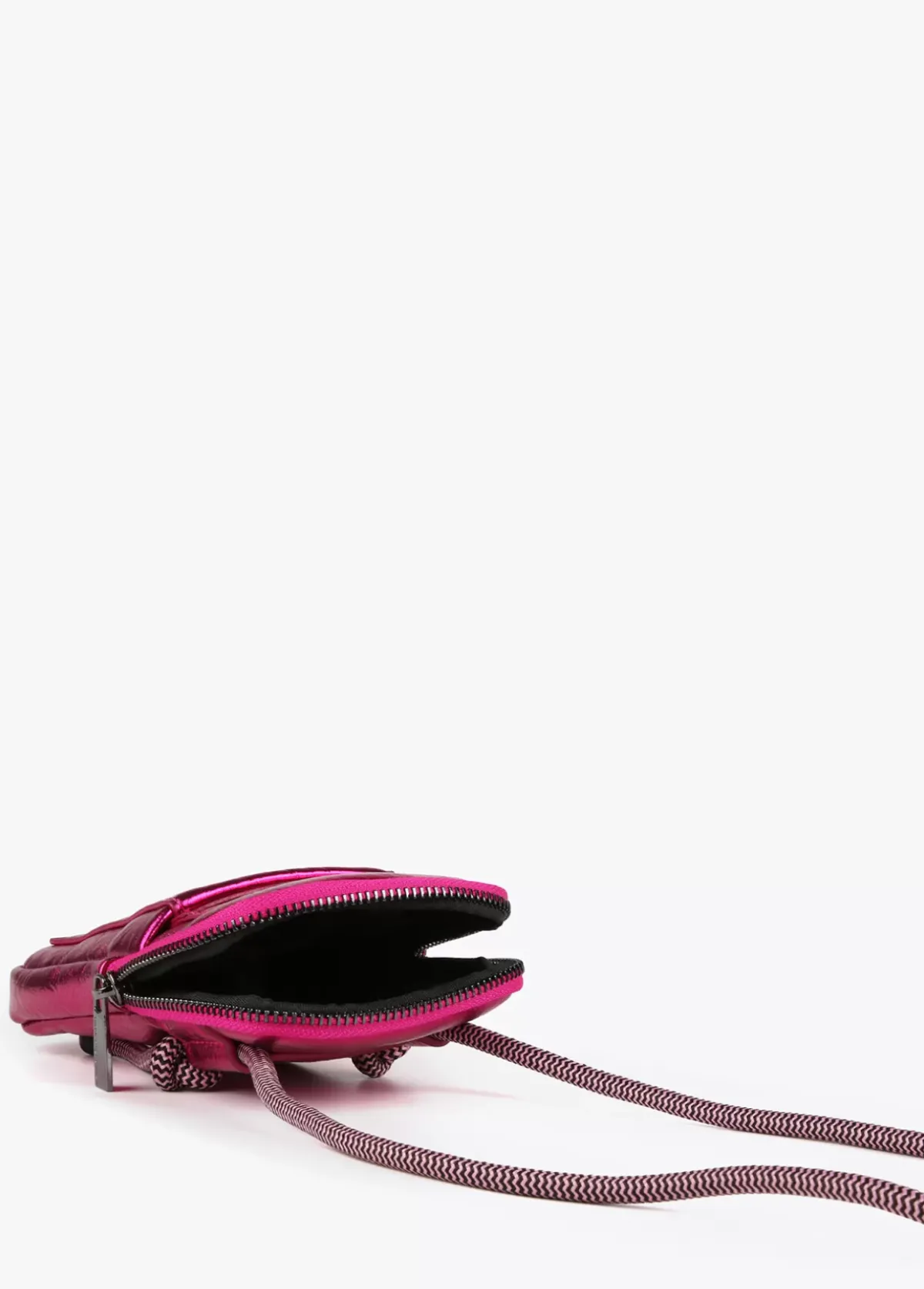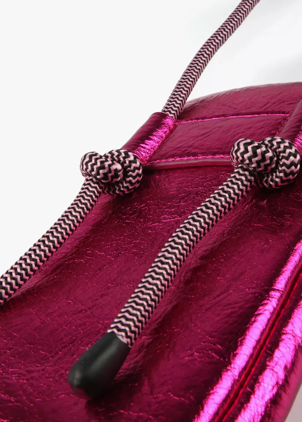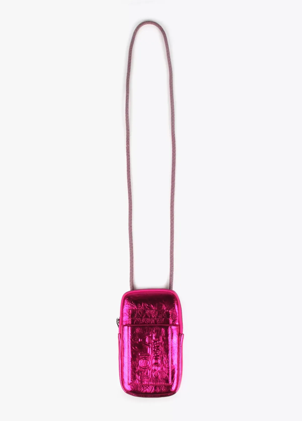 Bolsito porta móvil metalizado con logo grabado en relieve y cierre de cremallera. Asa bandolera de cordón ajustable.