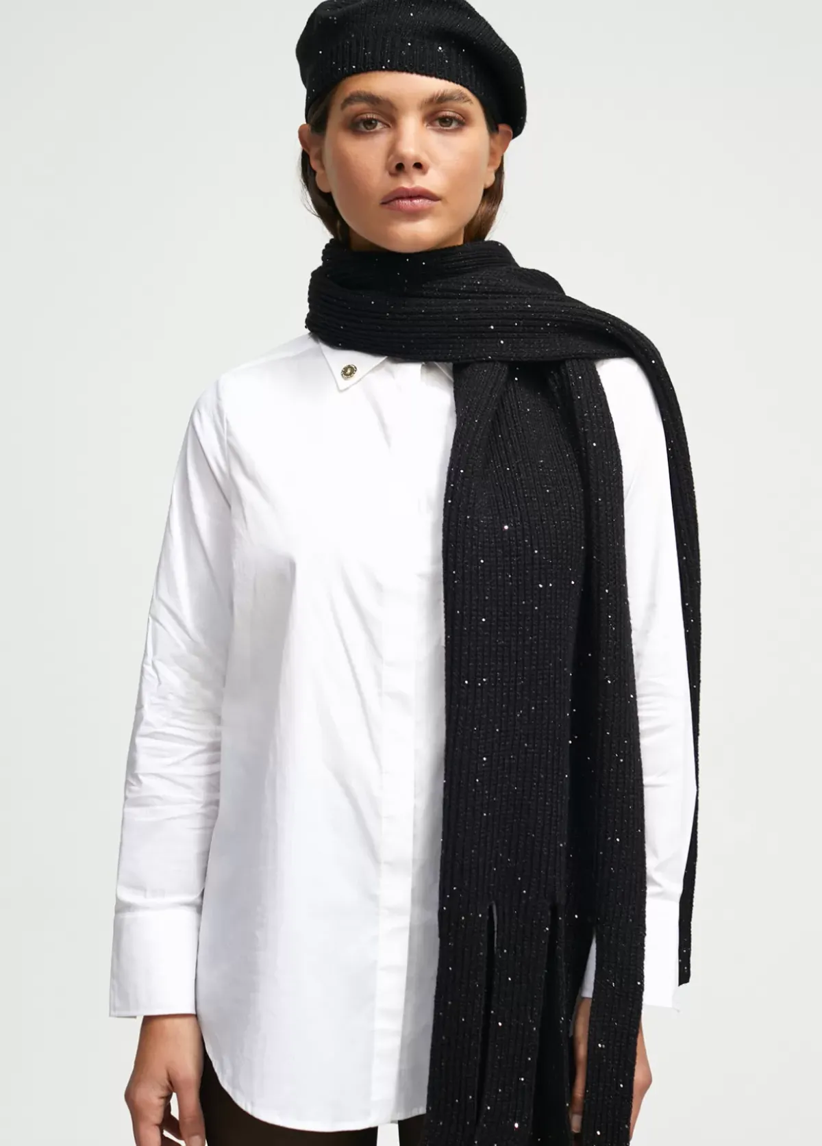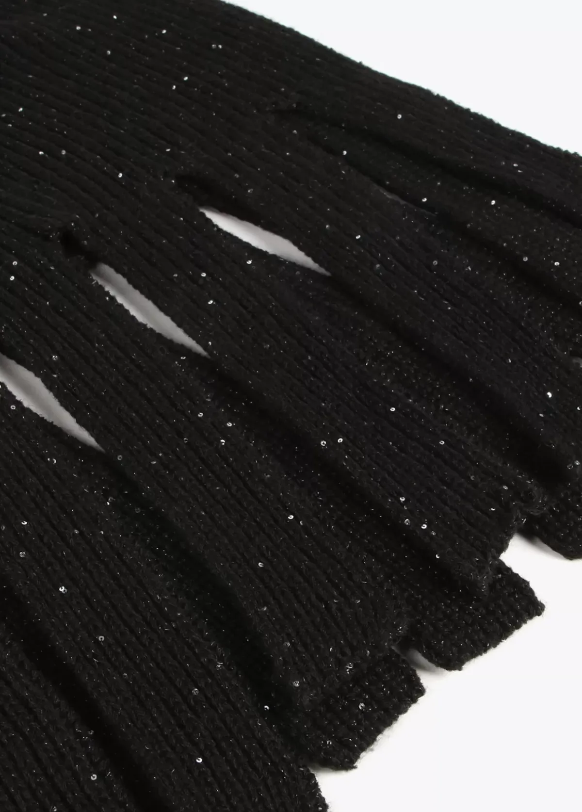 Bufanda ancha en color negro con mini lentejuelas al tono. Flecos en extremos del mismo tejido.
