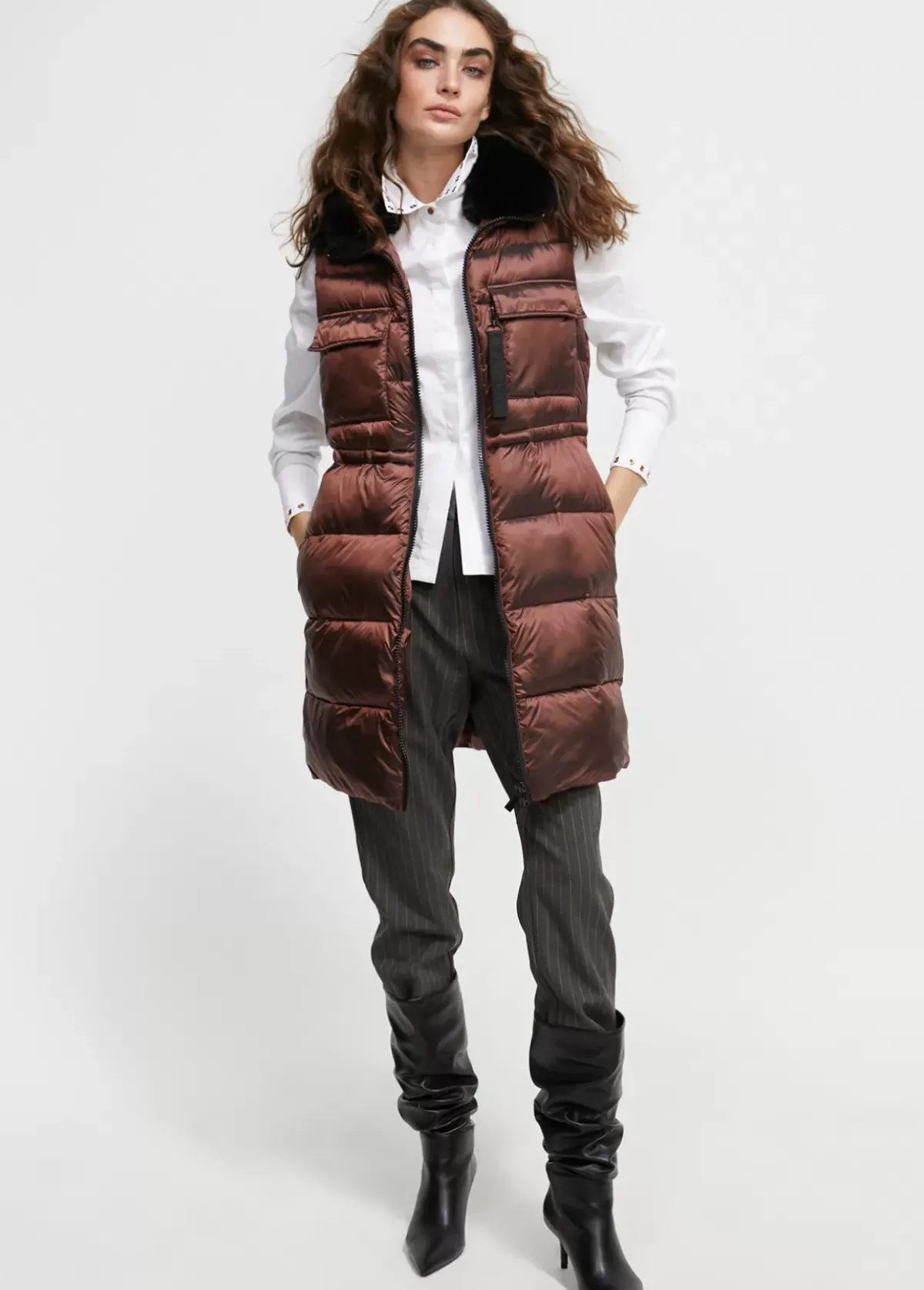 Chaleco acolchado efecto metalizado. Cuello de pelo. Bolsillos superiores tipo plastrón con tapete. Bolsillos laterales cerrados con cremallera. Cintura ajustable. Cierre con cremallera de doble carro.