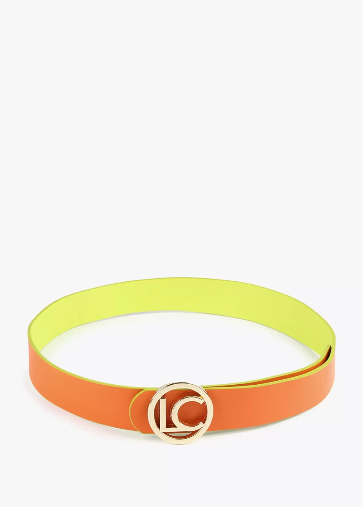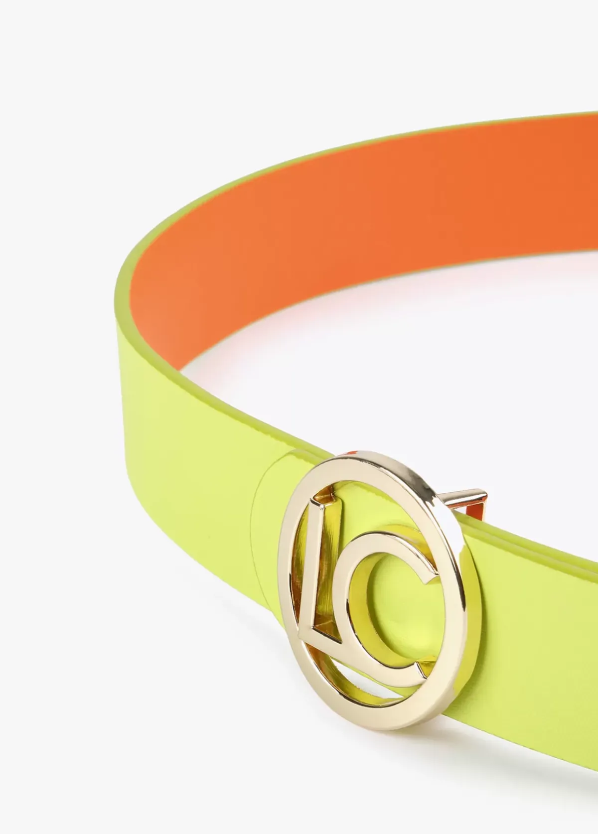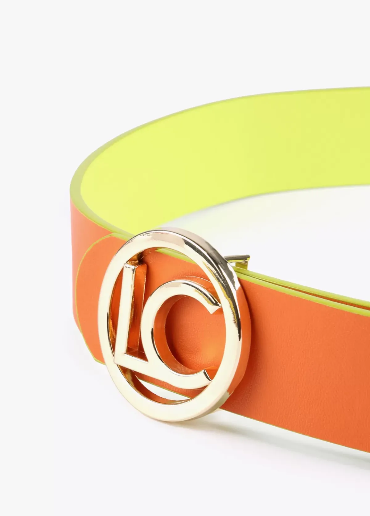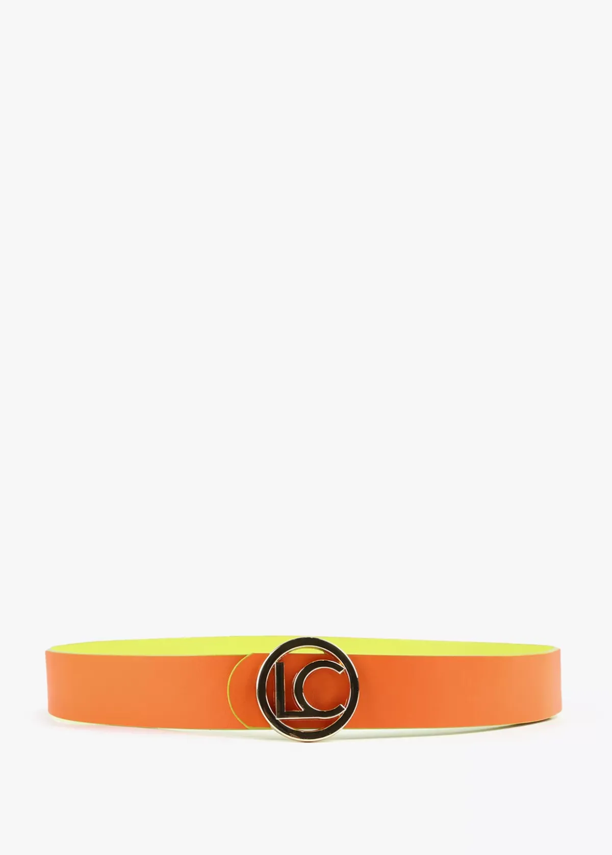 Cinturón reversible en efecto piel con hebilla y logo redondos y dorados.