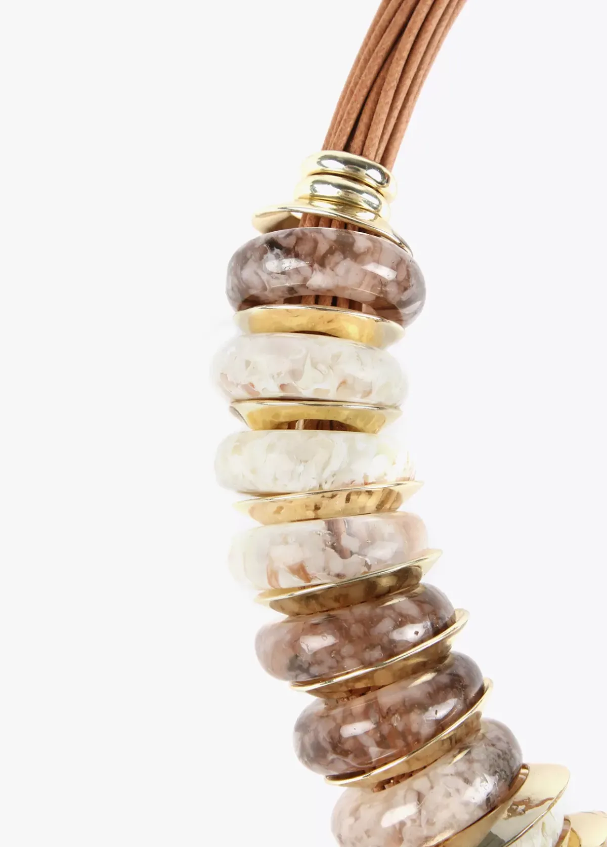 Collar de piezas redondas acrílicas en tonos crudos y marrones y metálicas en color dorado. Cierre ajustable y medallita logotipada.