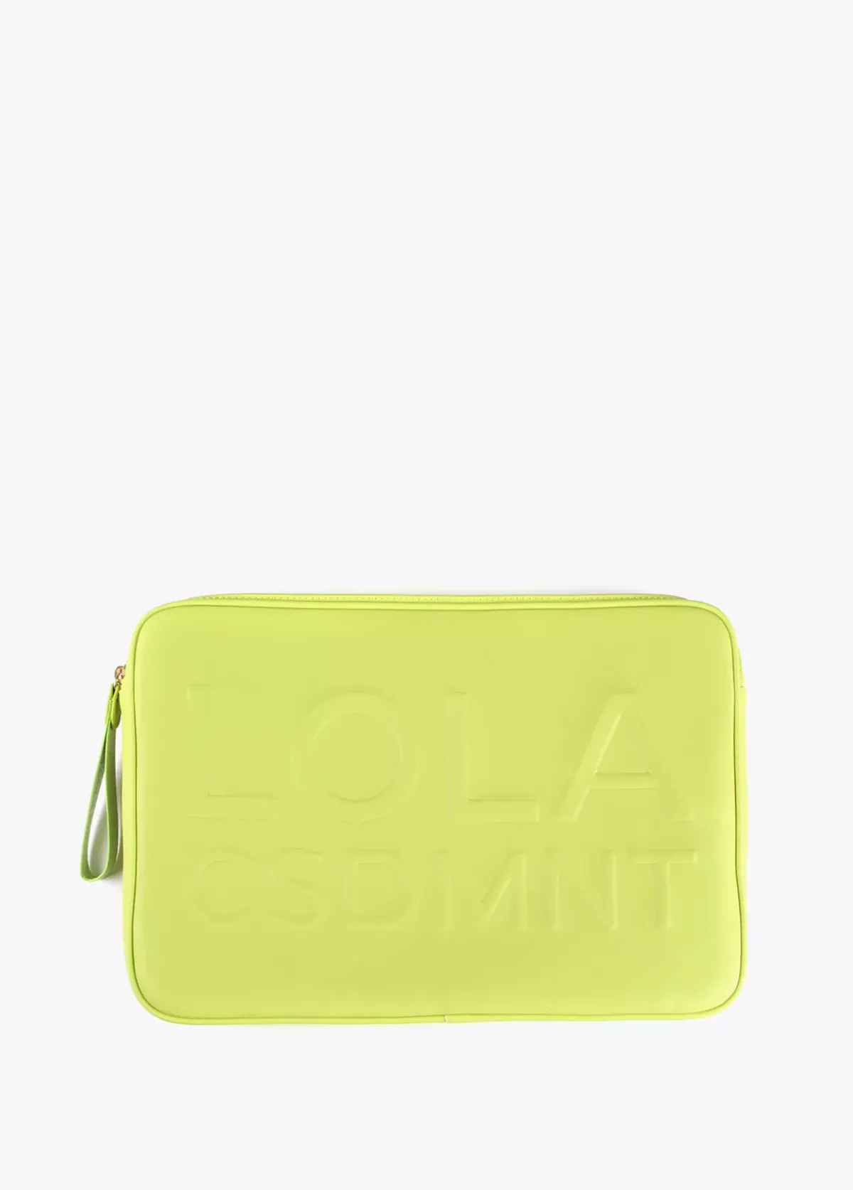 Funda para ordenador en efecto piel con logo en relieve en parte frontal. Cierre con cremallera, bolsillo exterior con botón click y asa de mano logotipada.