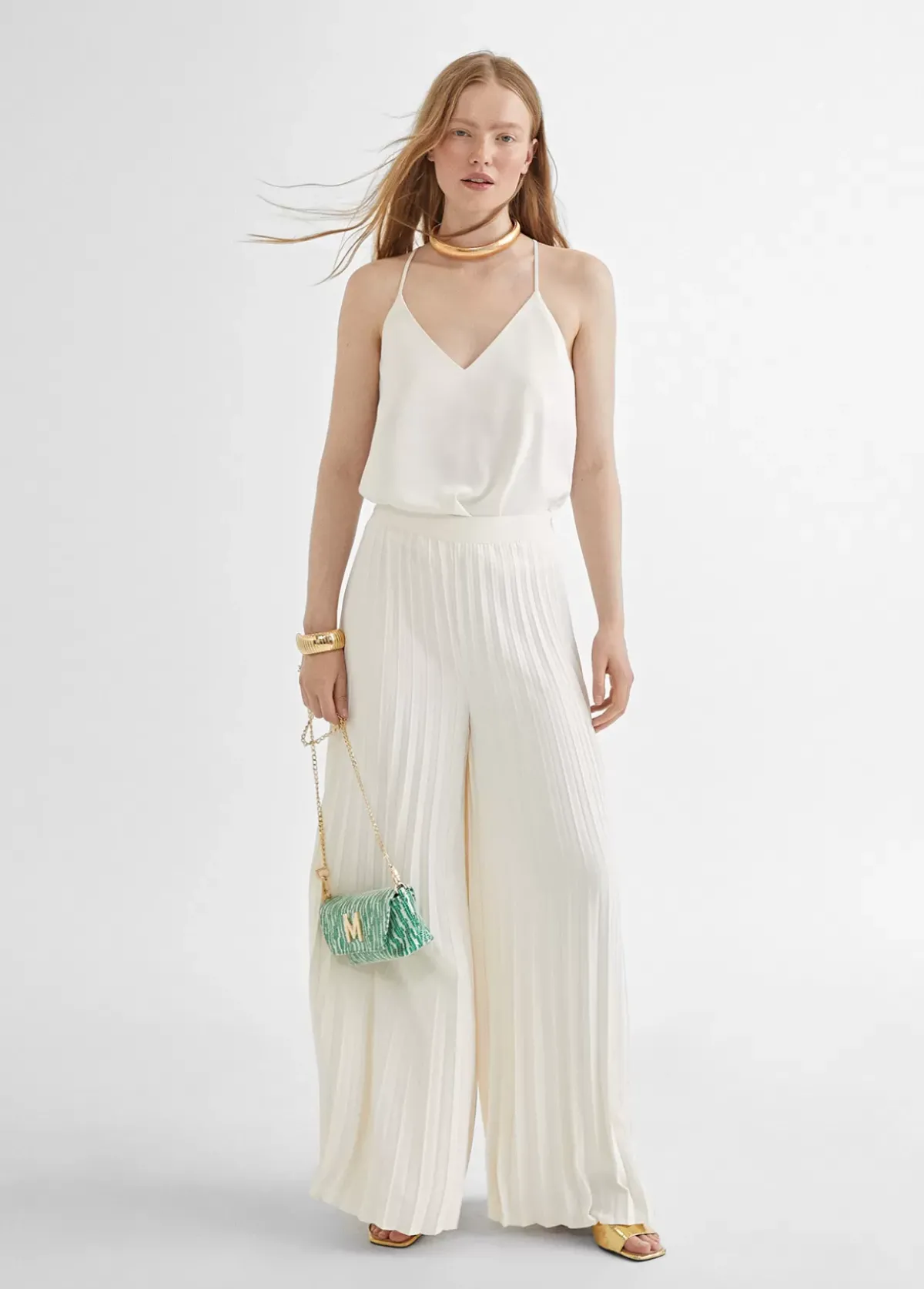 Pantalón plisado y fluído en color blanco. Detalle letra logo dorada en parte trasera.