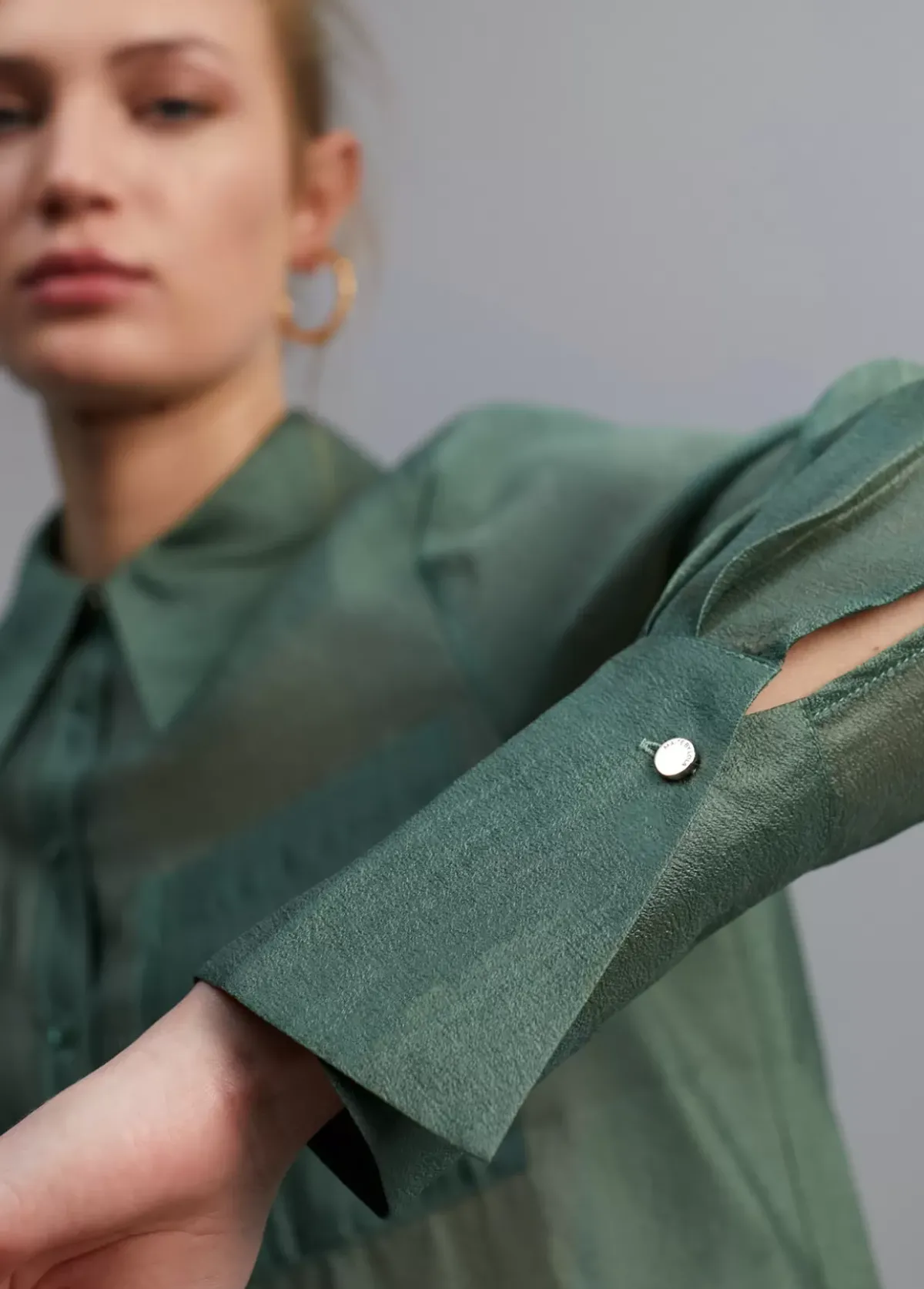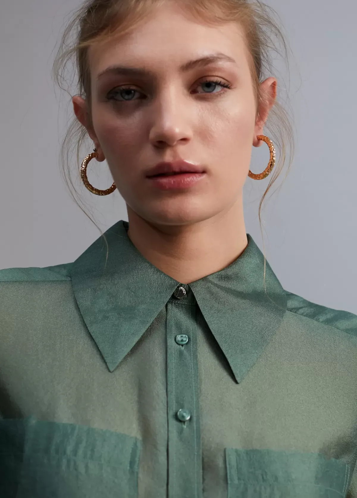 Blusa efecto organza con transparencia. Cuello y puños camiseros. Bolsillos plastrón en frontal. Cerrada con motones a tono-