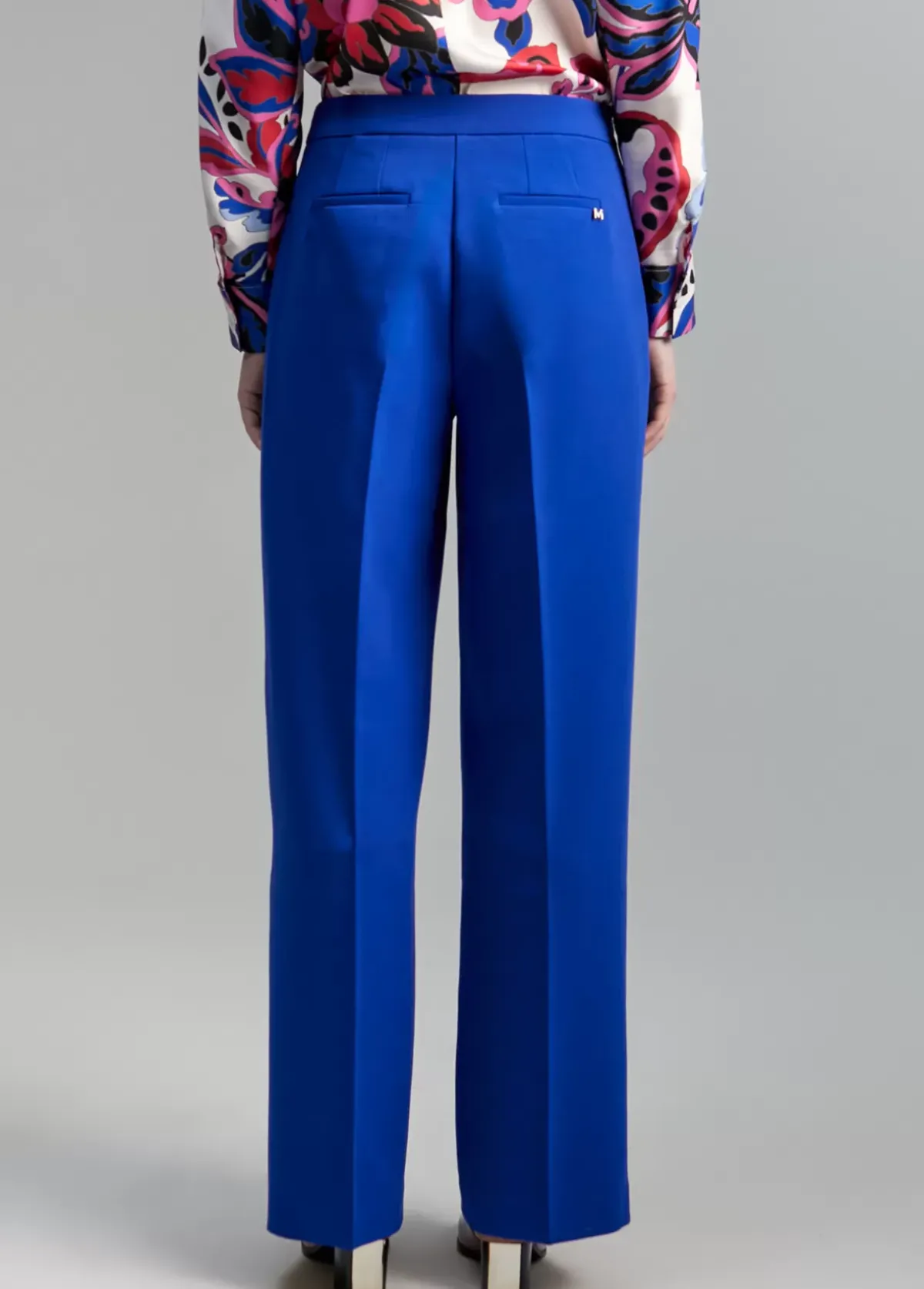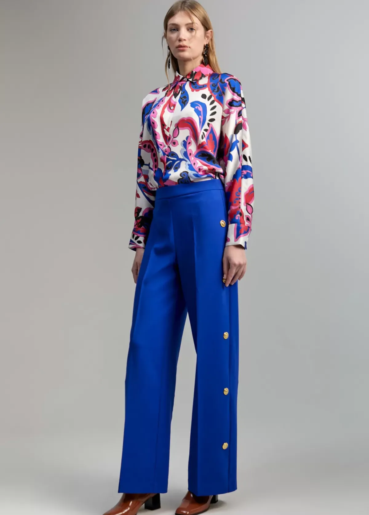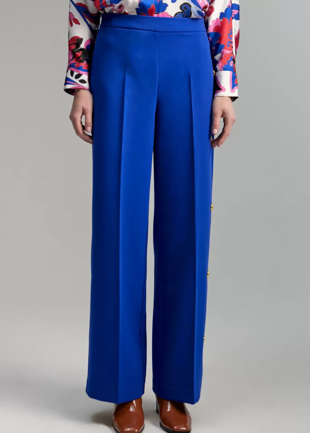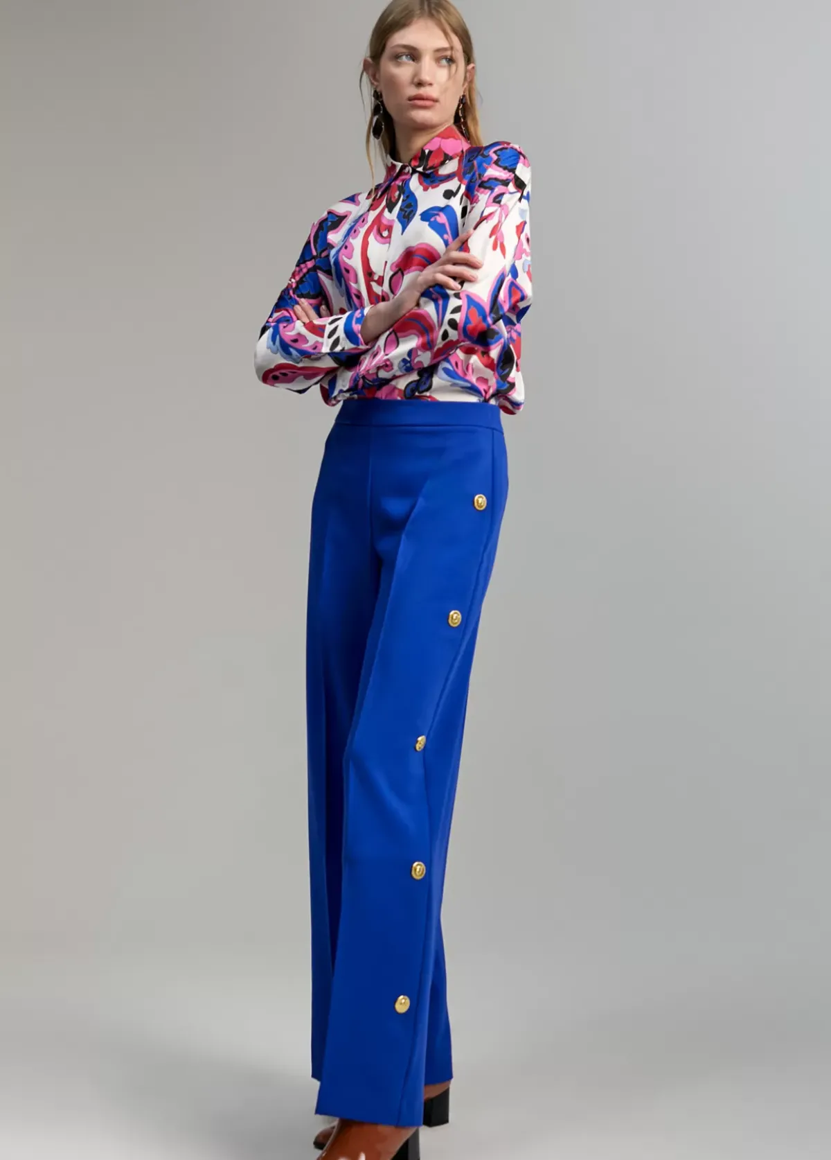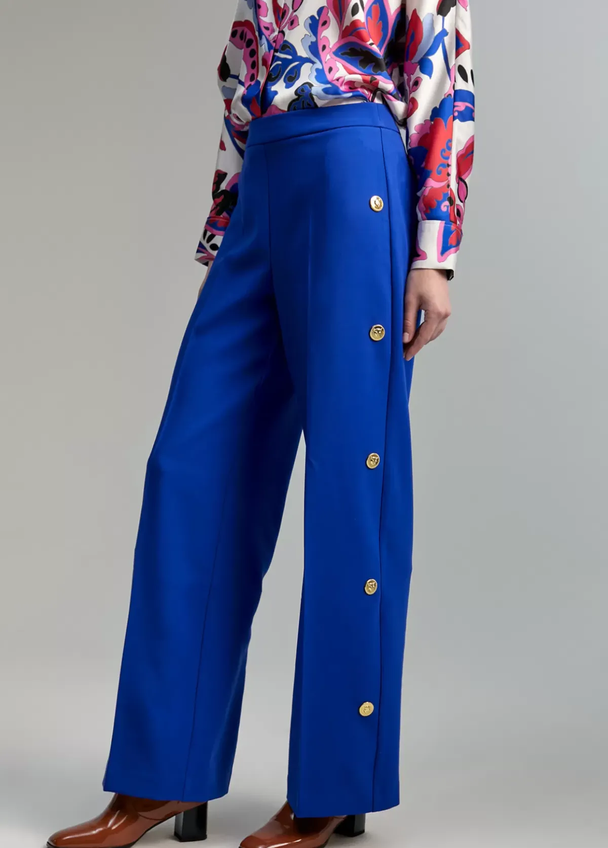 Pantalón recto, cerrado con cremallera lateral. Detalle de snaps metálicos tigre en lateral pernera.