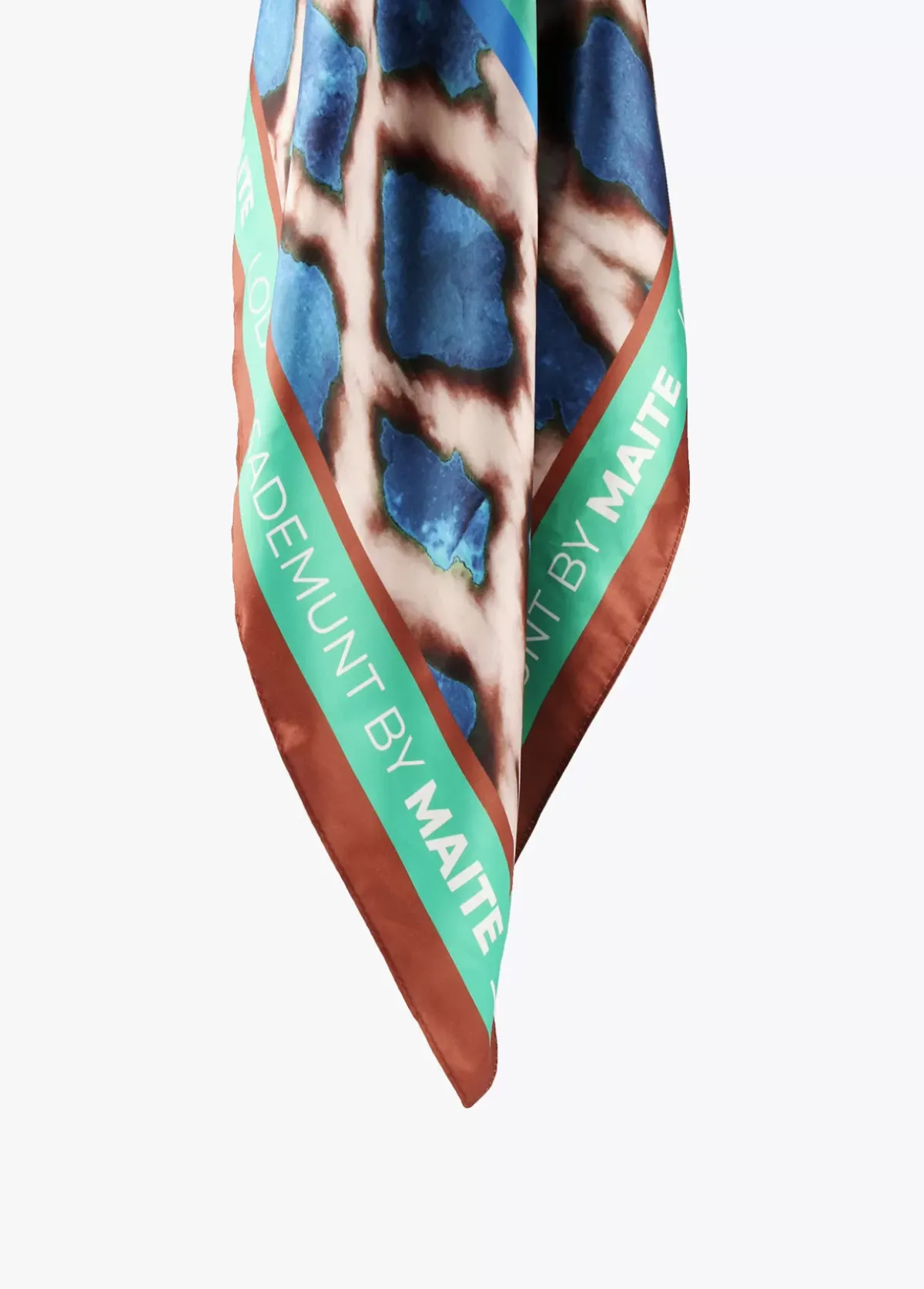 Pañuelo con maxi letra M en zona central con fondo animal print en color verde y azul. Contorno logotipado.