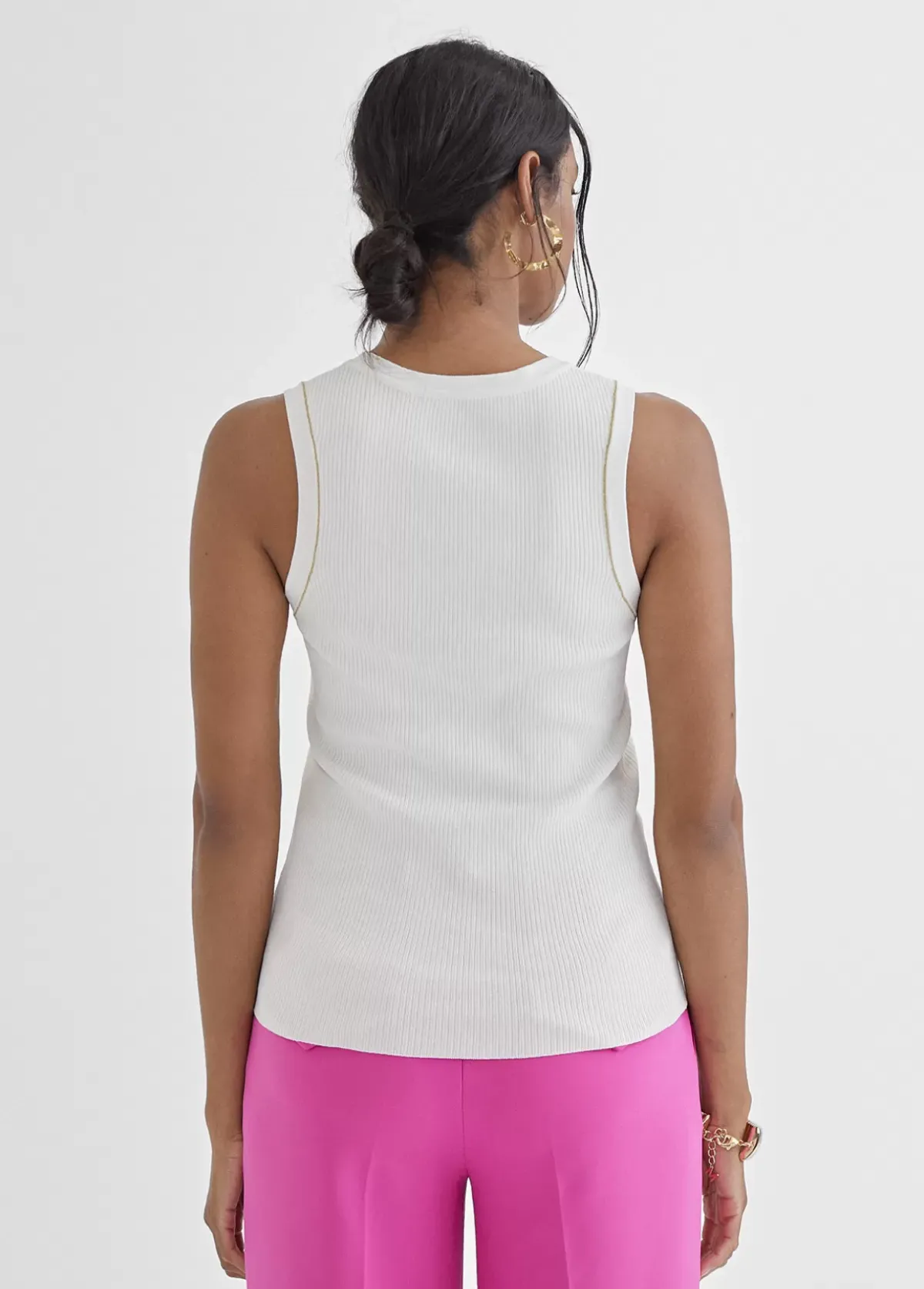 Top de punto ajustado. Escote redondo, tirante ancho con detalle en lúrex a contraste.
