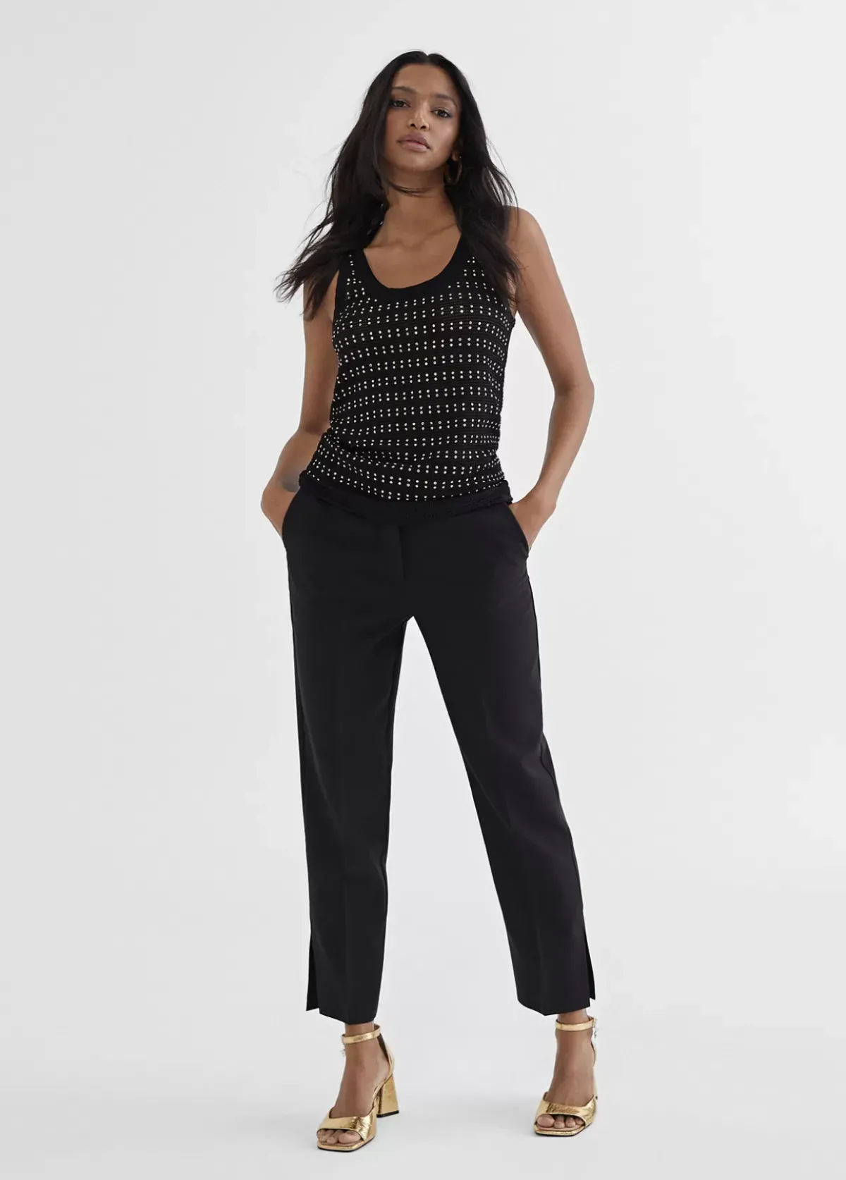 Top semi transparente en color negro y detalles brillantes en parte delantera. Logotipo dorado en parte trasera.