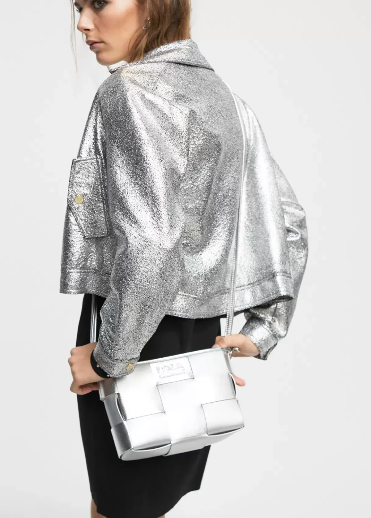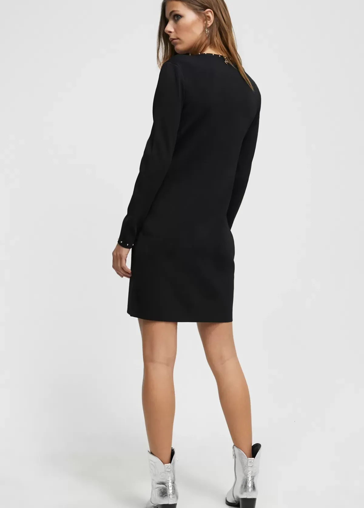 Vestido corto de punto con cuello pico. Detalle de tachas doradas en cuello, frontal y puños.