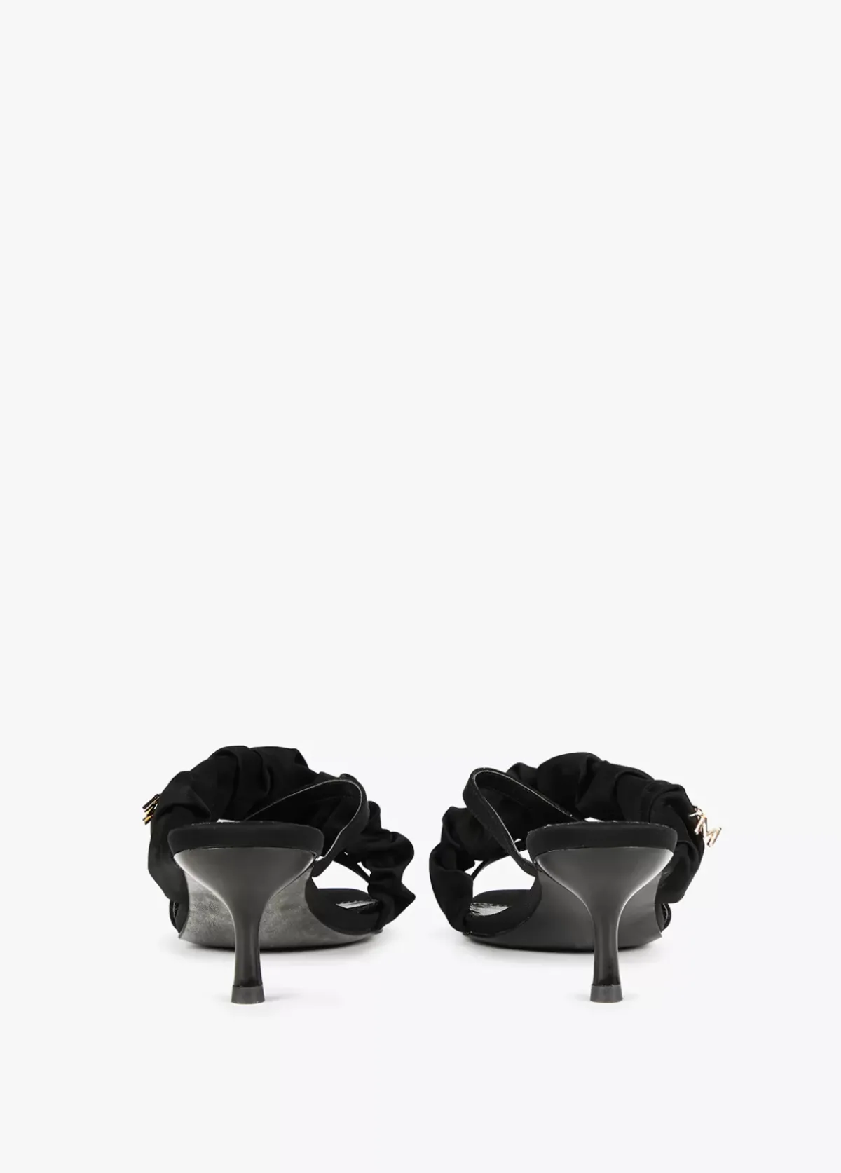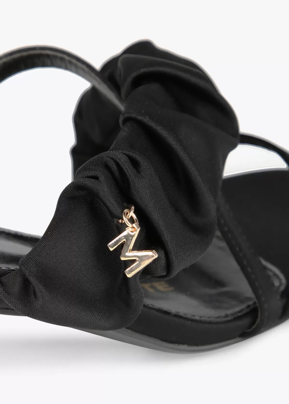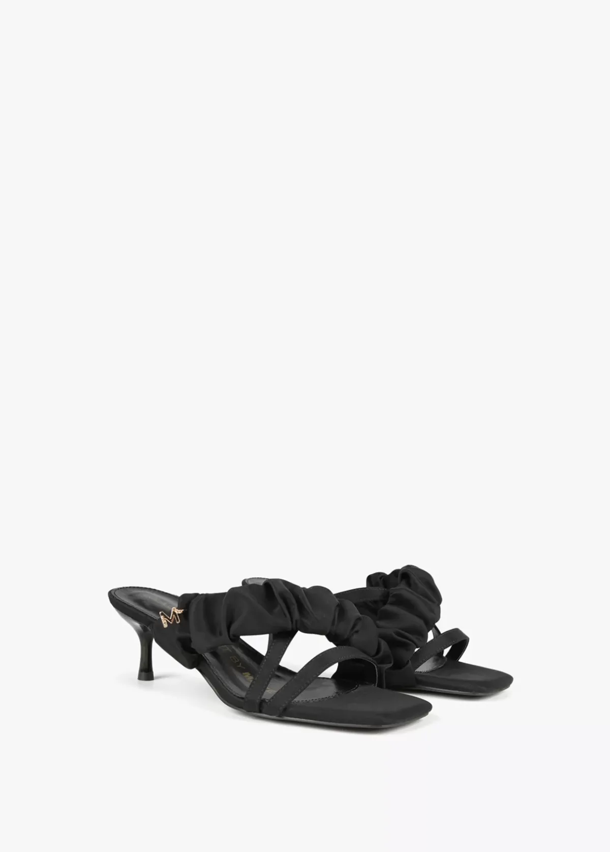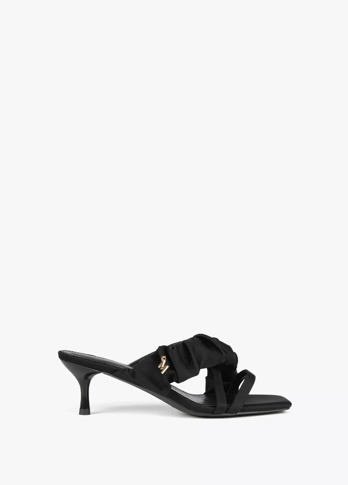 Sandalia de tacón medio con dos tiras y tira fruncida con detalle letra M dorada en su lateral. Plantilla logotipada.