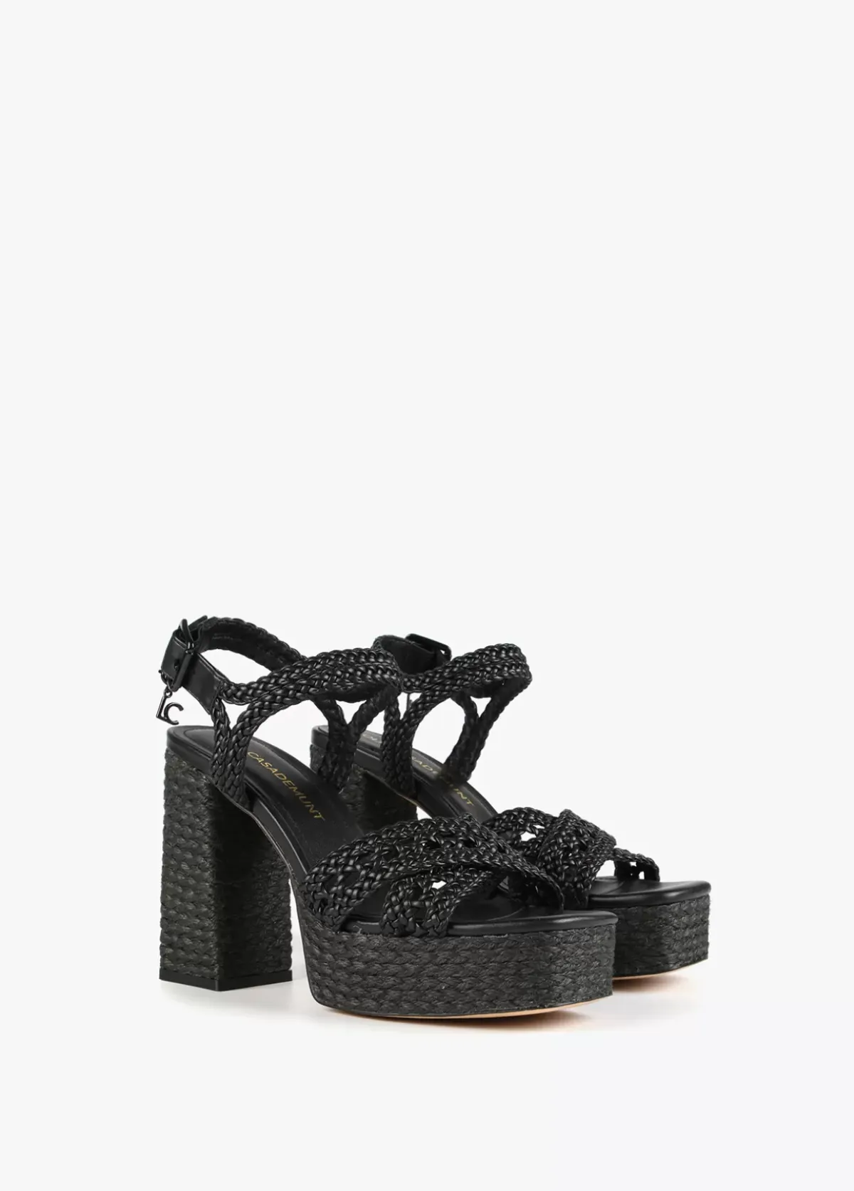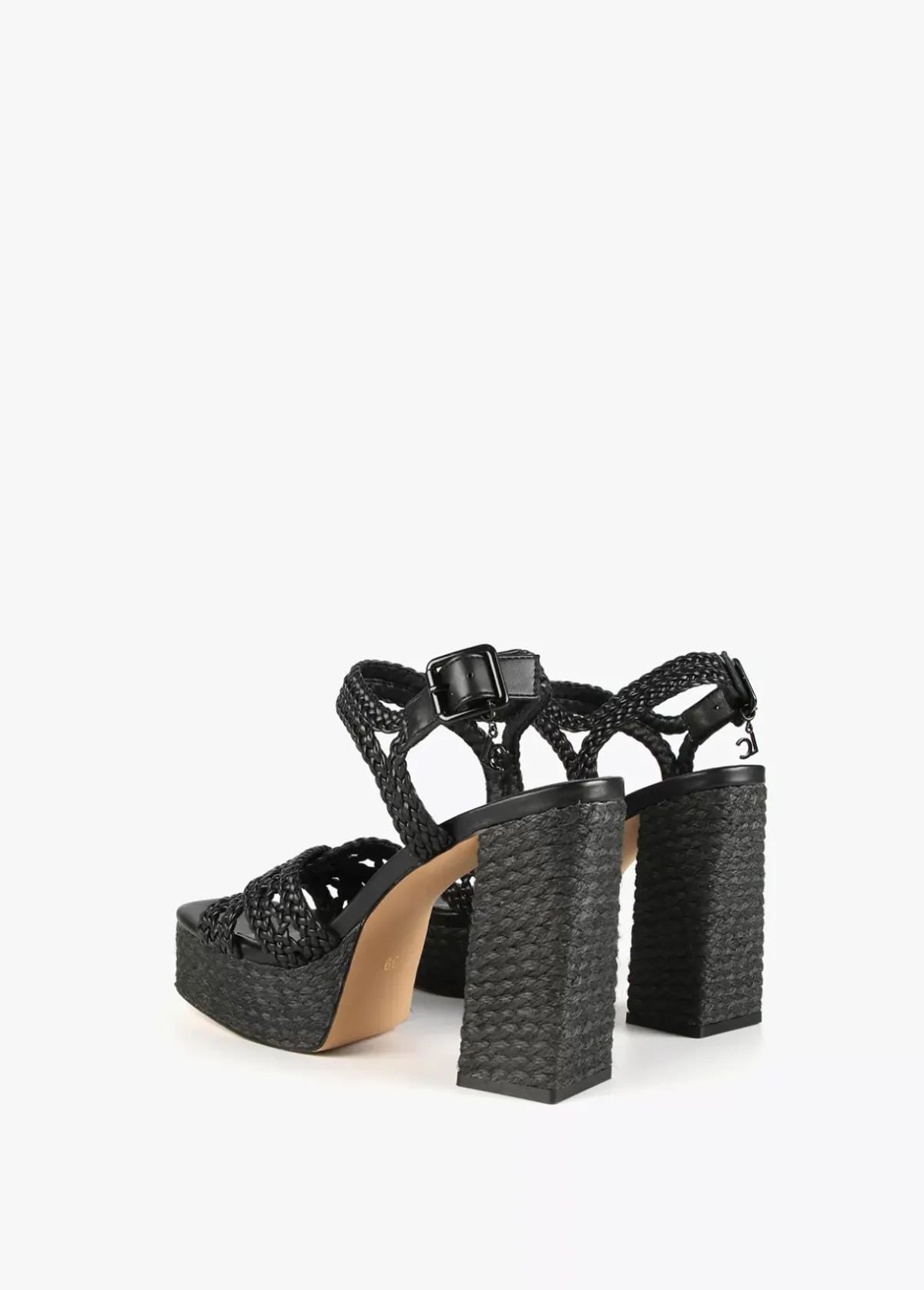Sandalia de tacón alto con plataforma defecto crochet y ráfia. Plantilla logotipada y detalle medallita logotipo al tono en hebilla.