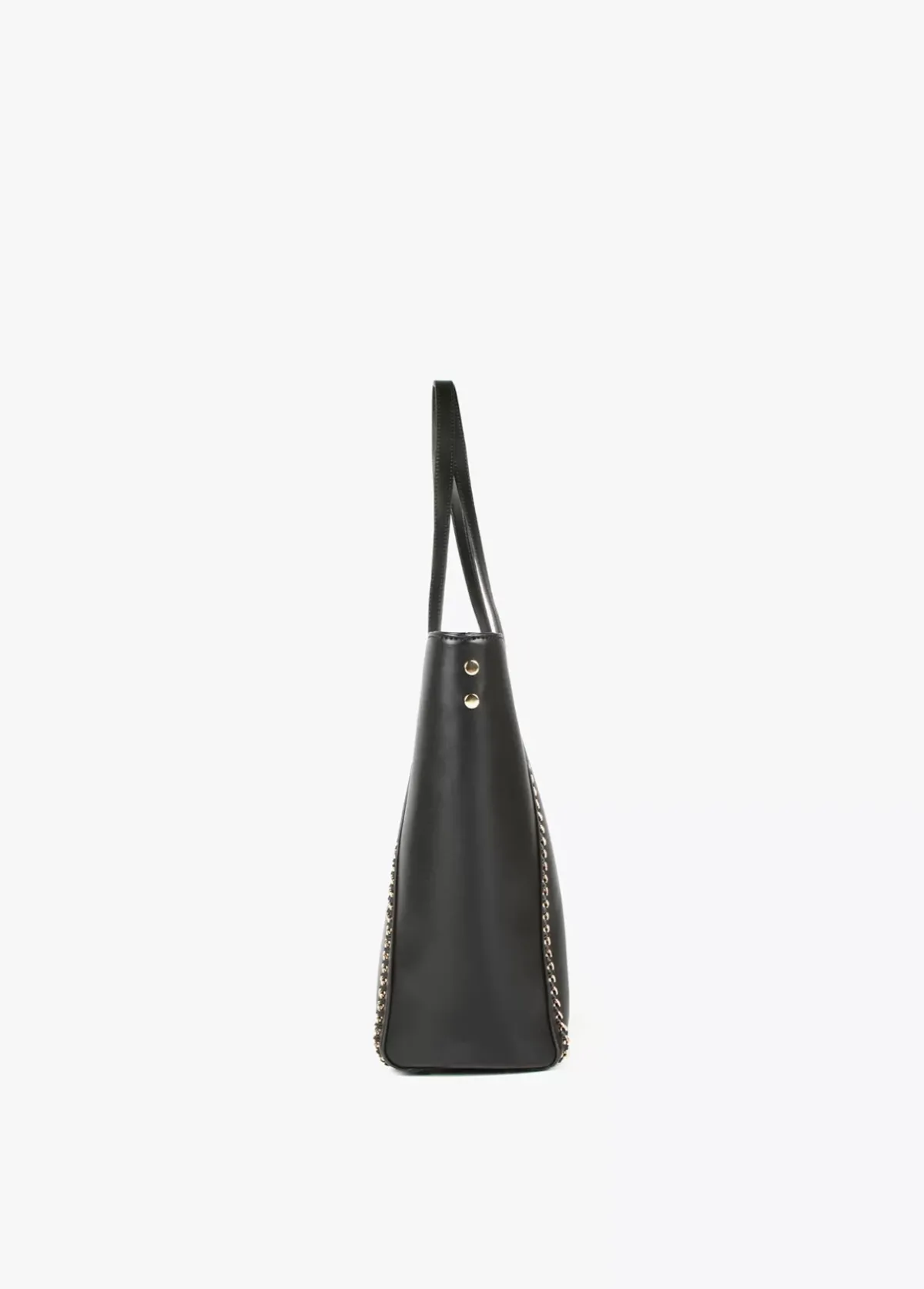 Bolso tipo shopper en efecto piel con detalle cadenas doradas. Logo grabado en parte frontal, asas de hombro y cierre con botón imantado en lengüeta.