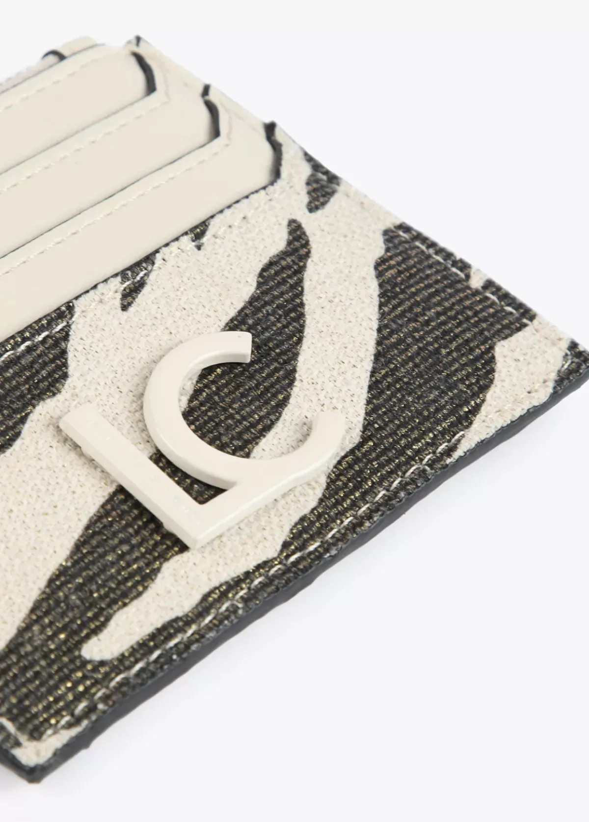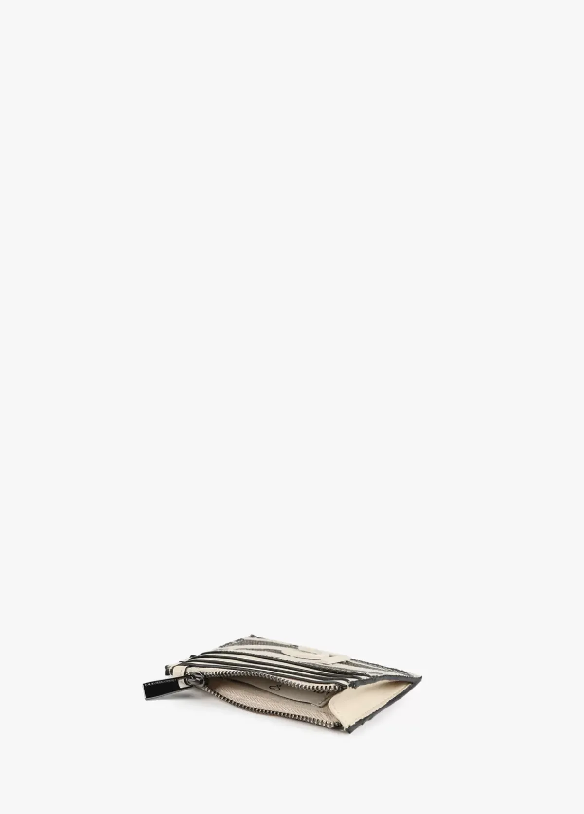 Tarjetero tejido estampado animal zebra. Bolsillo con cremallera y letras logo lacadas en parte frontal.